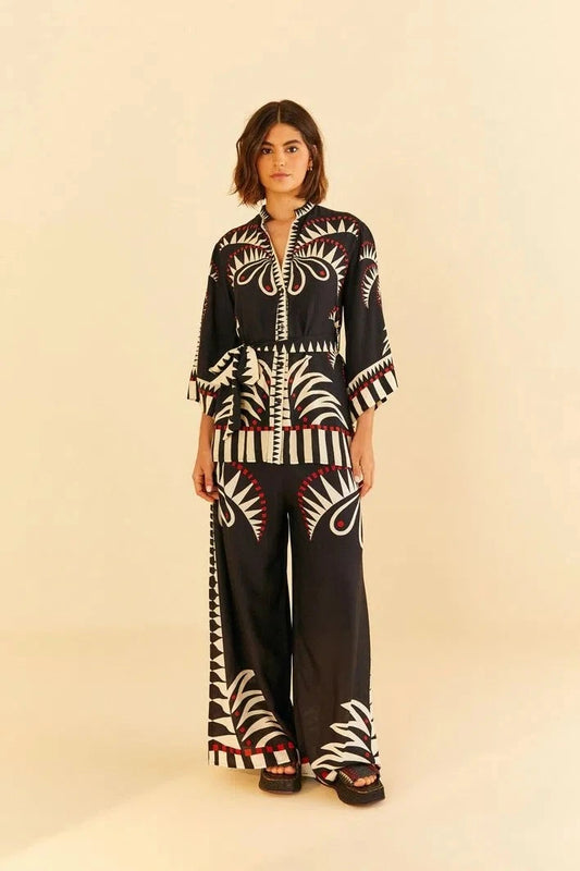 This outfit appears to be a modern bohemian kaftan set featuring bold and artistic prints....