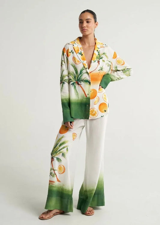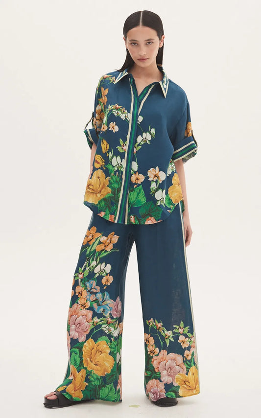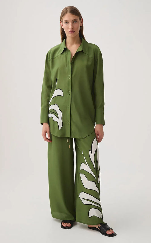 The Planetary Silk Drawcord Pant in Abstract Fern is a wide leg, lightweight trouser featuring...