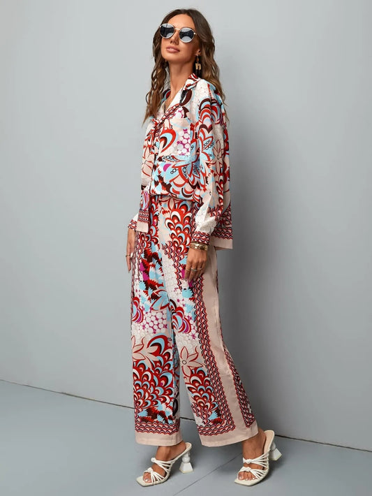 This outfit appears to be a modern bohemian kaftan set featuring bold and artistic prints....