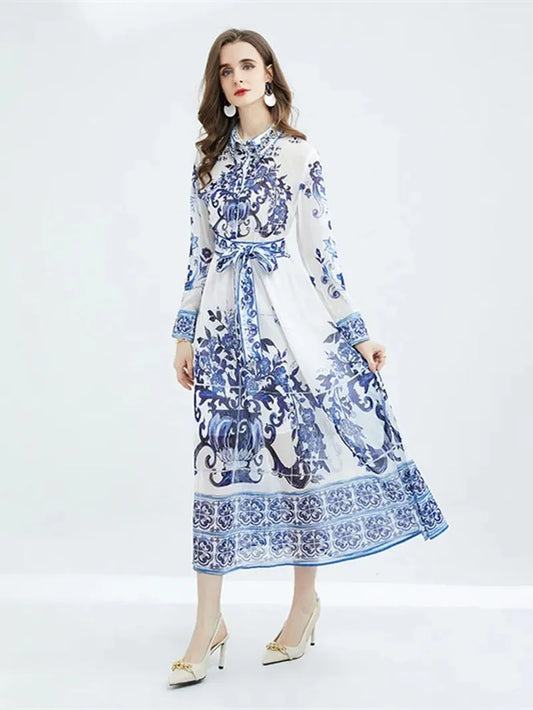 This is a long-sleeve printed maxi dress featuring an elegant white and blue porcelain-inspired design....