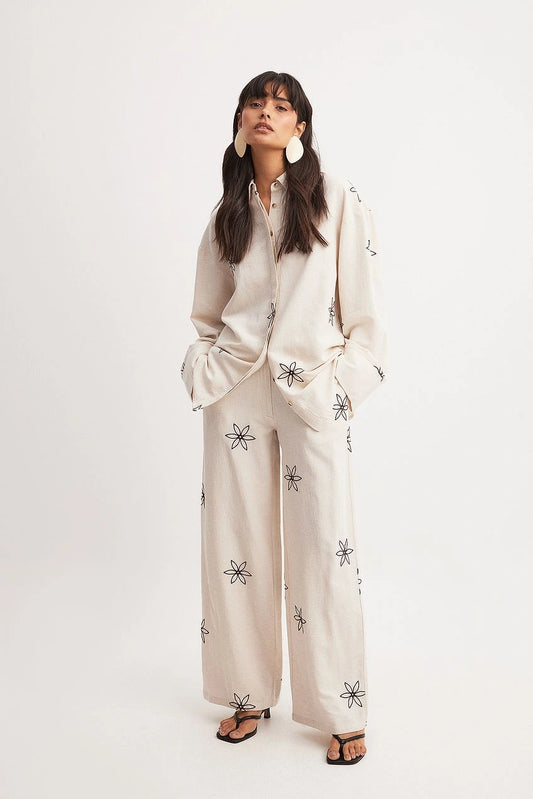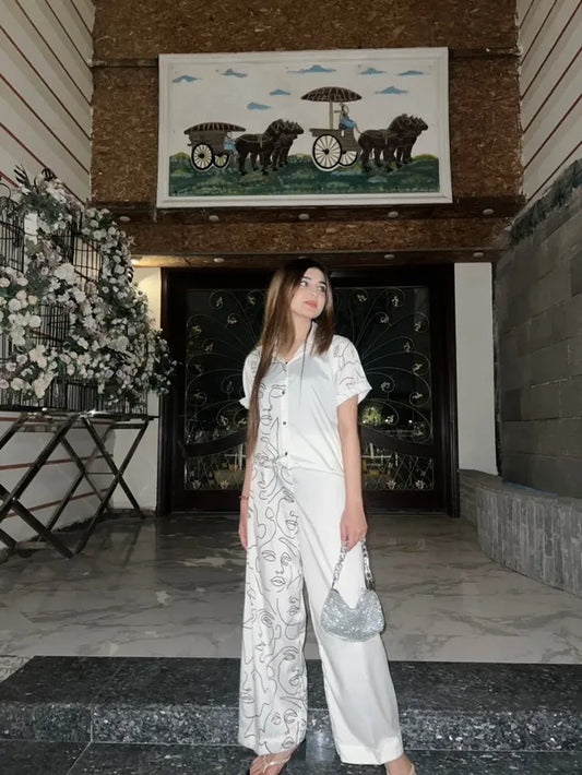 The ensemble includes a white top and matching wide-leg pants, both adorned with an abstract...