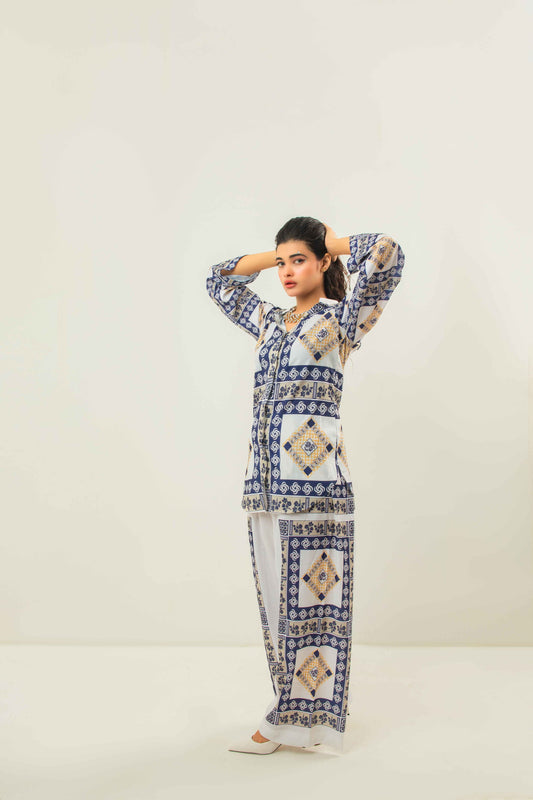 Printed Shirt With TrousersBand Neckline With Placket & Buttons Detail, Straight Sleeves, Round HemColor: Beige...