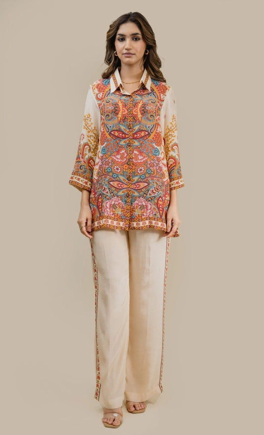 This elegant two-piece outfit features a beautifully printed paisley shirt with rich, vibrant tones and...