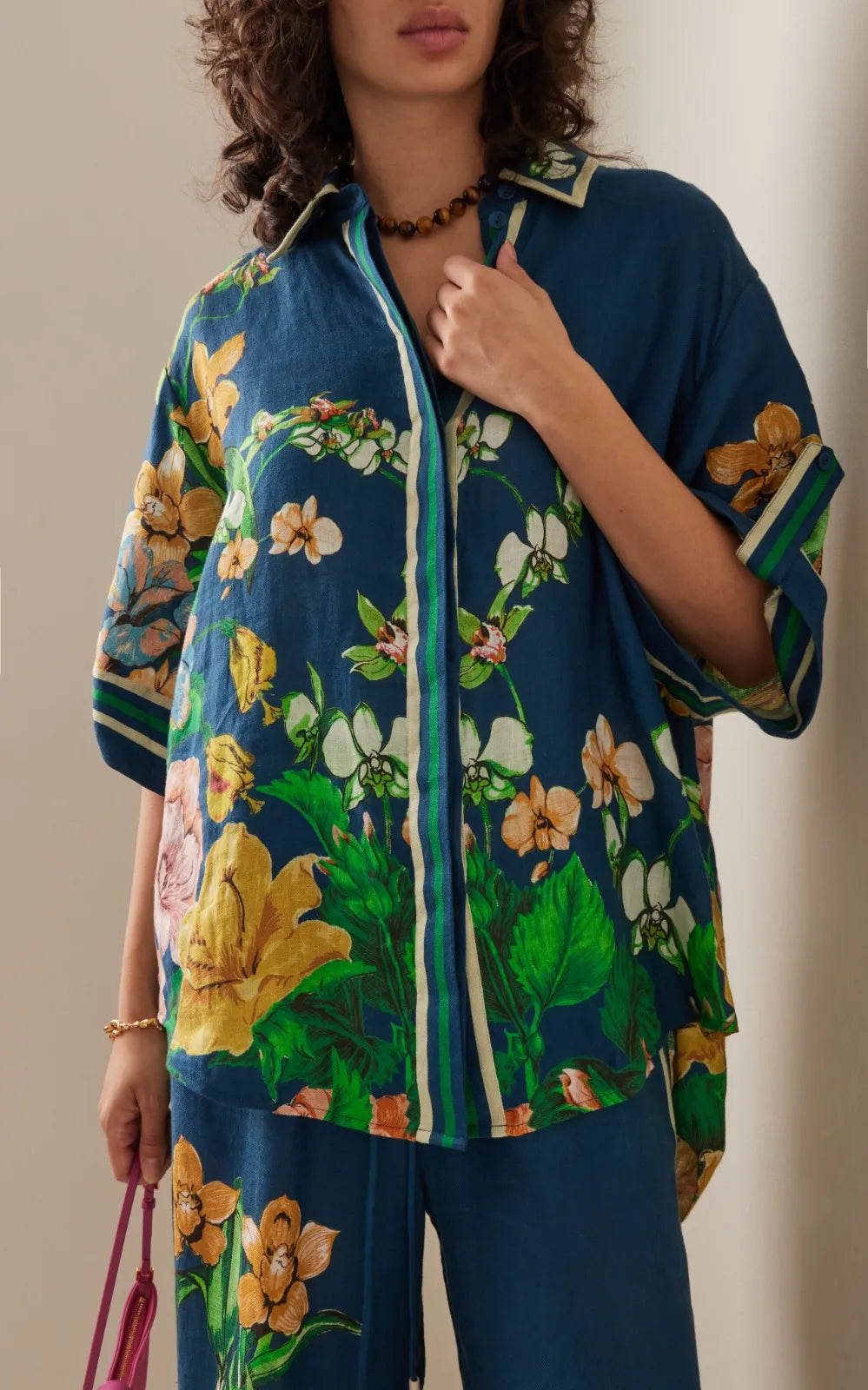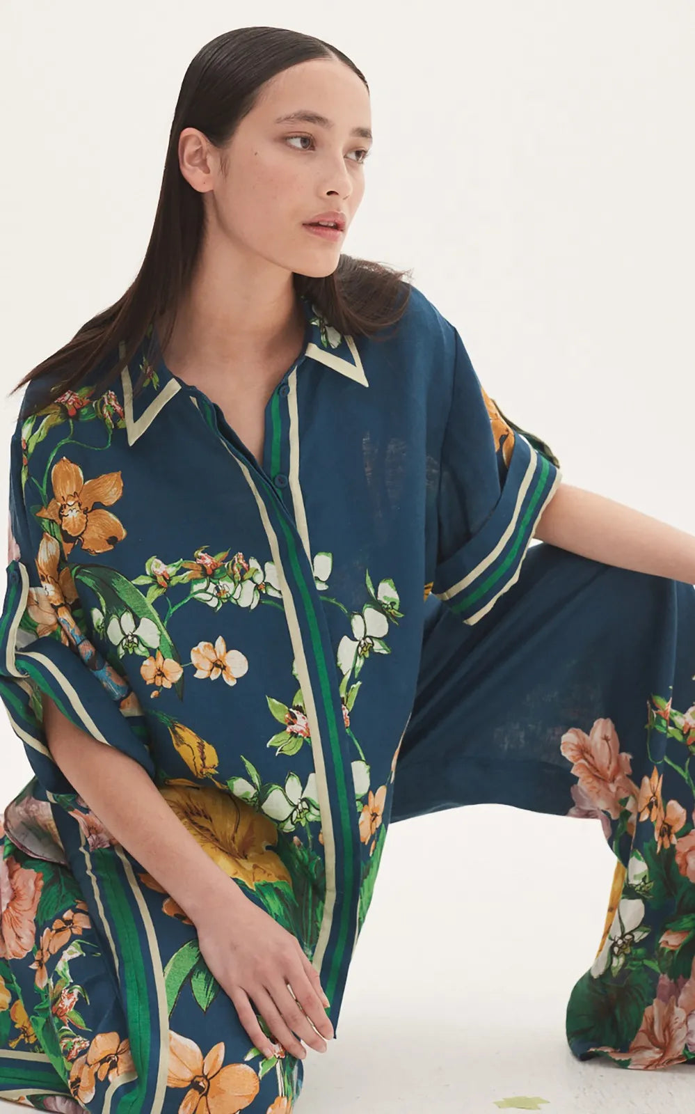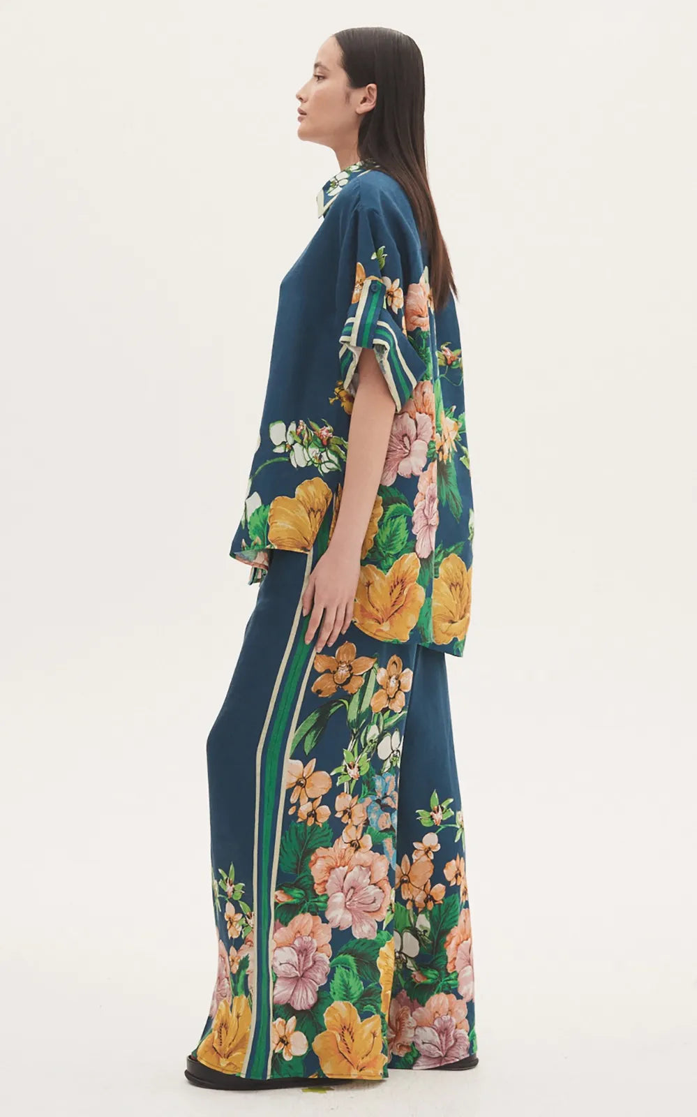 Tailored for an oversized fit, this short-sleeved linen twill shirt is printed throughout in tropical florals. Complete the look and pair with the matching pants.
