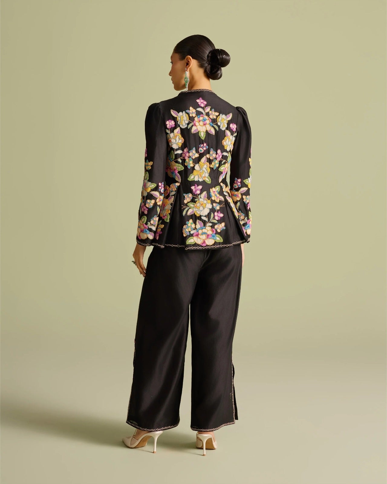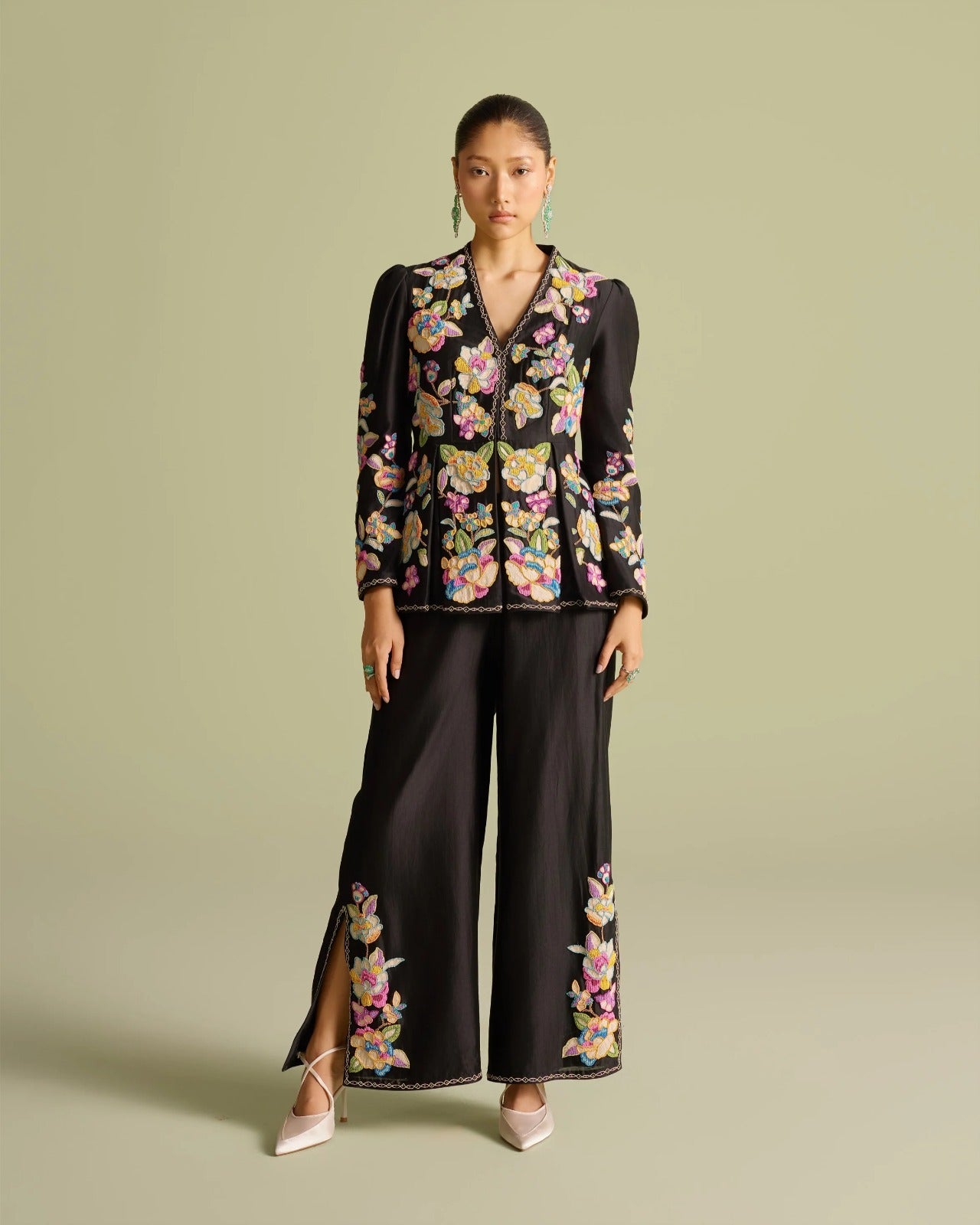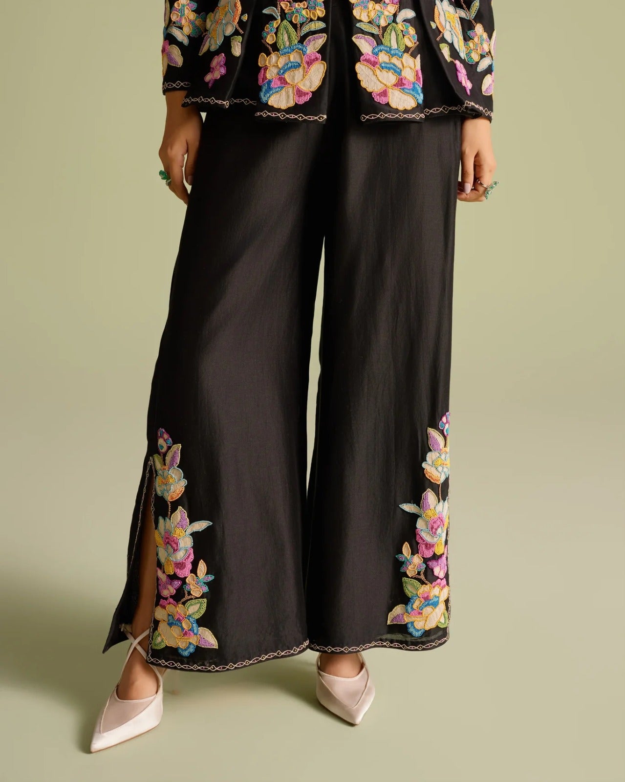 Black Chanderi Cordwork And Beadwork Flared Pants With Side Slit Detail