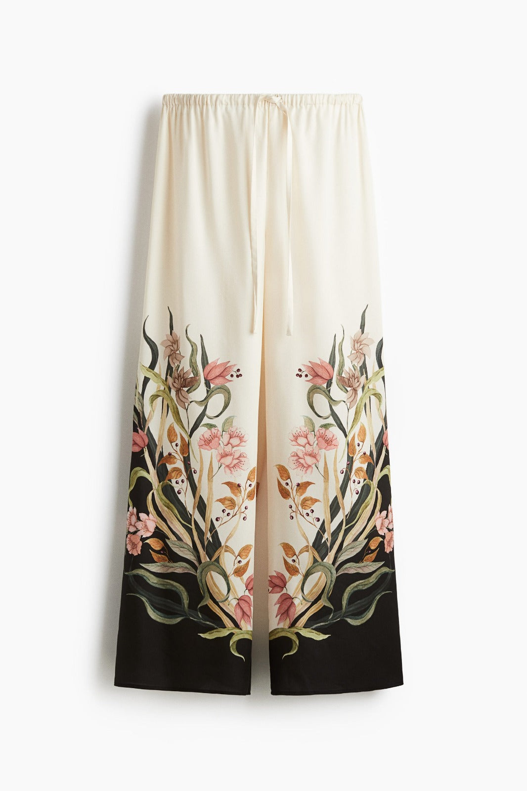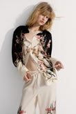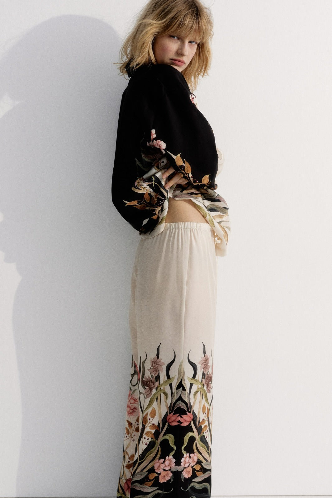 A stylish floral co-ord set featuring a black printed top paired with cream wide-leg trousers detailed with beautiful floral patterns along the hem. The top has a relaxed fit with long sleeves, offering an elegant and effortless look.