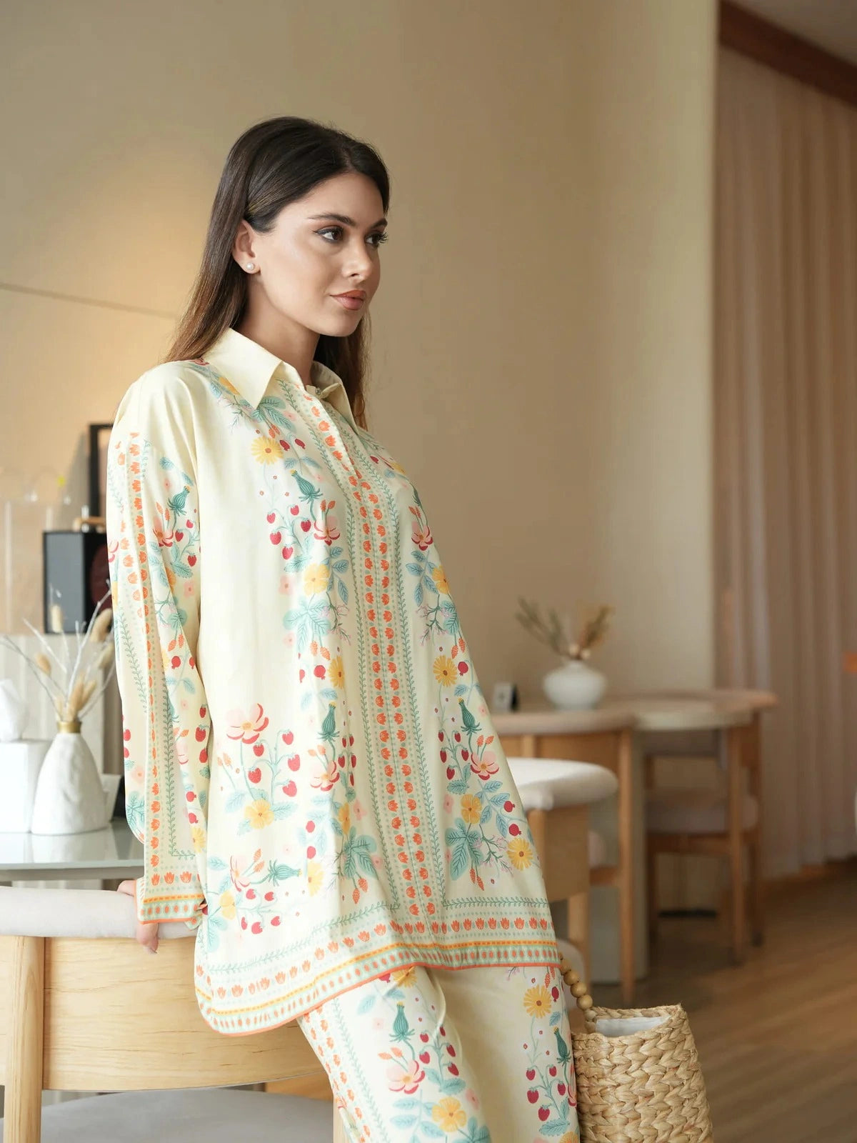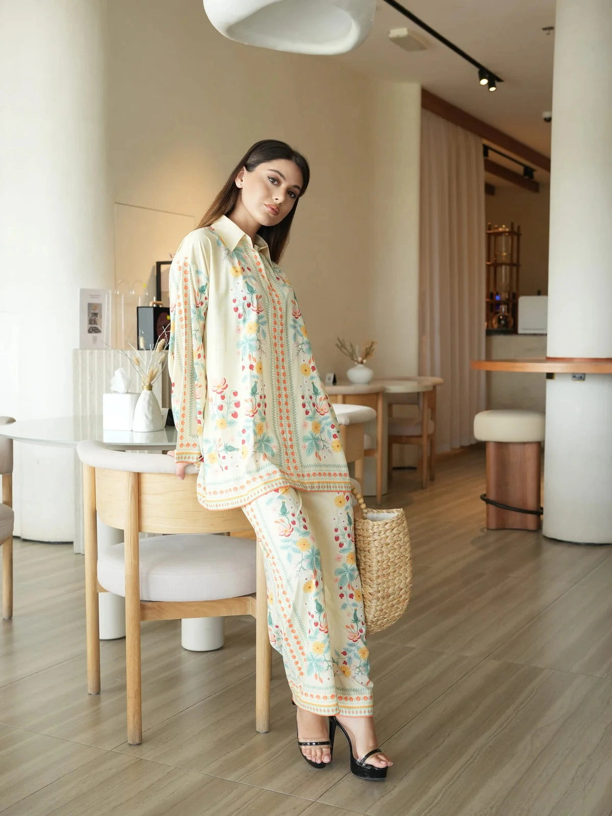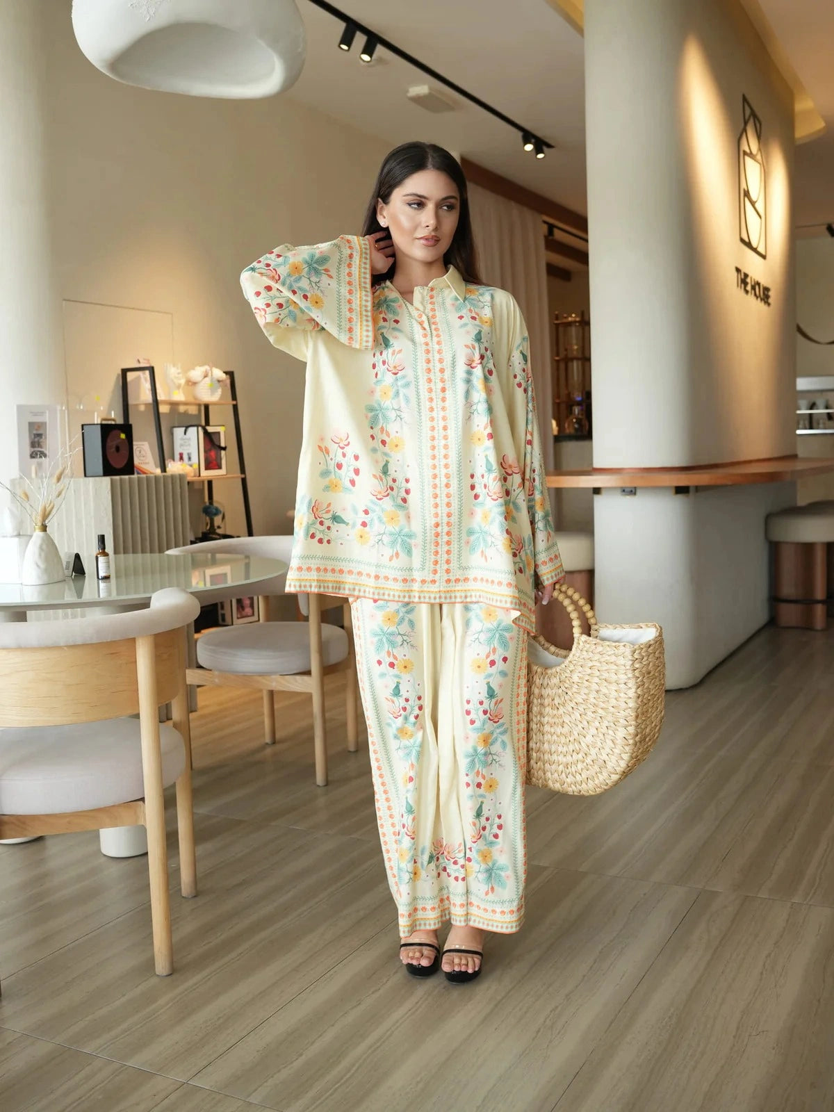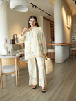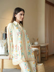 This elegant co-ord set features a soft pastel base enhanced with delicate floral prints. The straight-cut shirt is beautifully finished with subtle border detailing, paired with matching trousers that carry floral accents for a refined look. Perfect for casual outings, brunches, or daytime gatherings, this outfit offers a graceful, fresh, and effortlessly stylish appeal.
