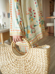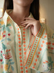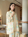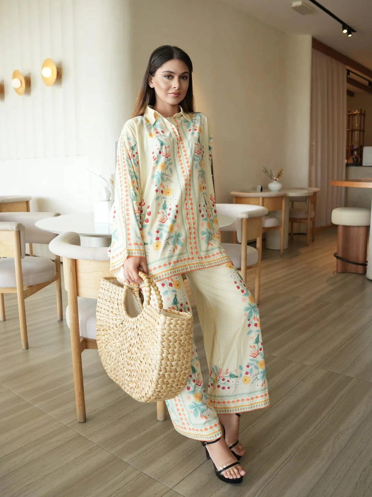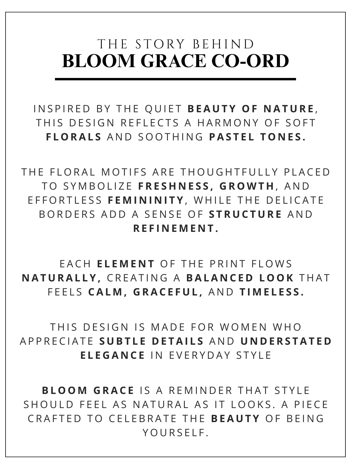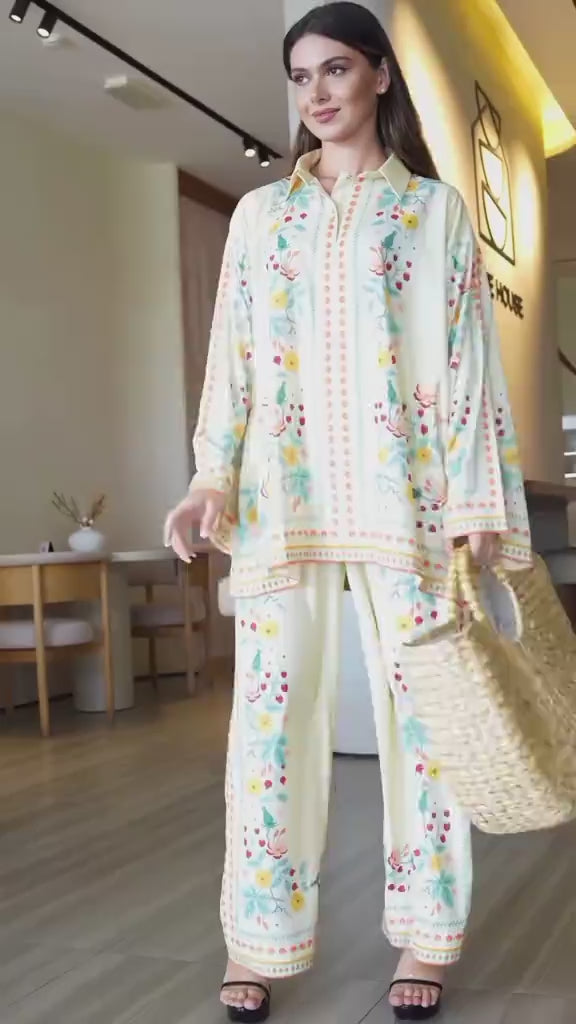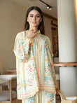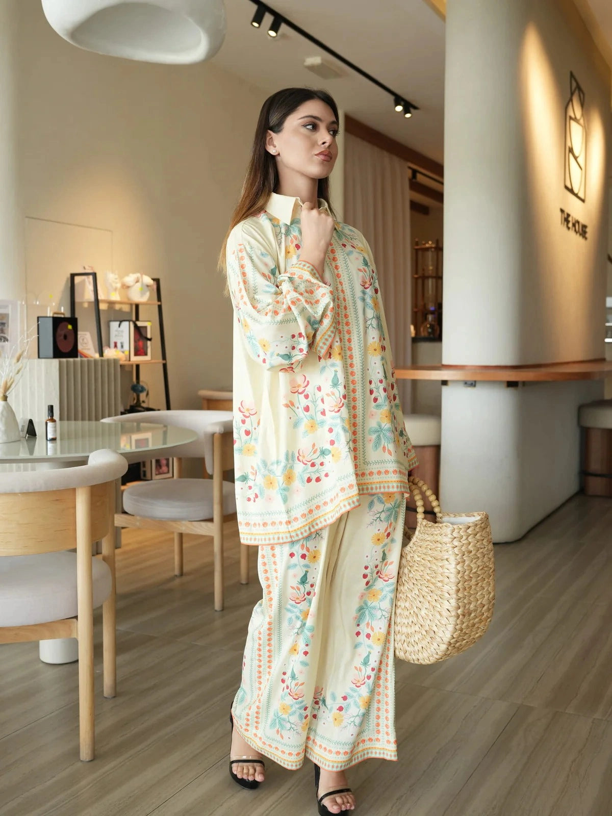 This elegant co-ord set features a soft pastel base enhanced with delicate floral prints. The straight-cut shirt is beautifully finished with subtle border detailing, paired with matching trousers that carry floral accents for a refined look. Perfect for casual outings, brunches, or daytime gatherings, this outfit offers a graceful, fresh, and effortlessly stylish appeal.