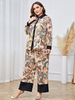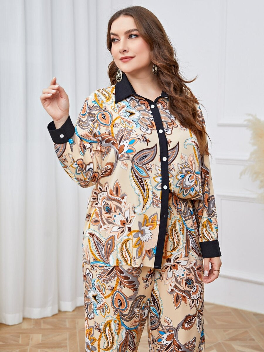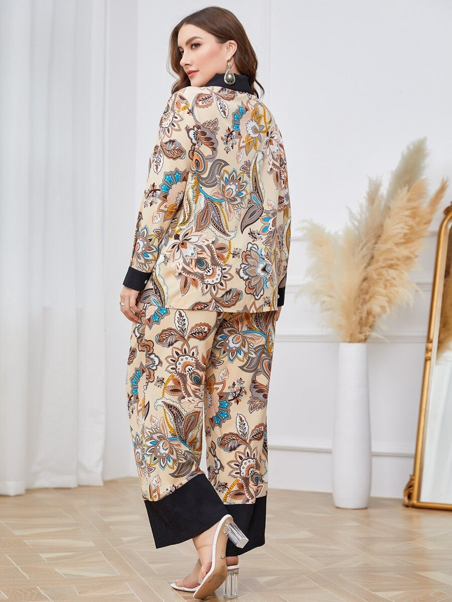 This stylish and comfortable co-ord set features a beautiful floral print on a beige base with intricate patterns in shades of blue, orange, and brown. The set includes a button-down shirt with a contrasting black collar and cuffs, adding a sophisticated touch. The matching wide-leg pants feature a relaxed fit with black detailing at the hem, making it a perfect choice for both casual and semi-formal occasions.