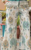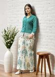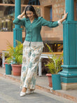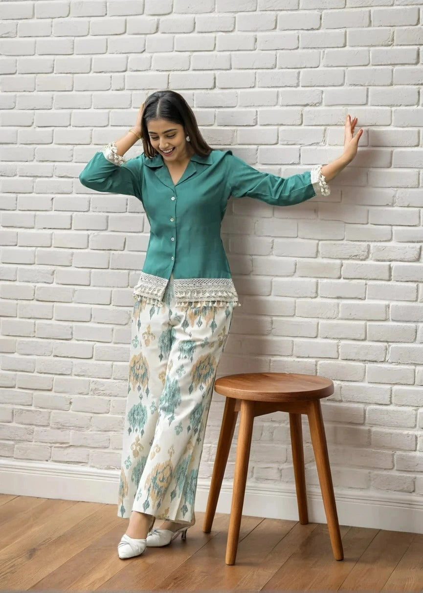 Add a touch of elegance to your everyday look with this chic two-piece set. The emerald green top features delicate lace detailing and tassels that bring a graceful finish, paired with beautifully printed ivory trousers for a refreshing contrast. Perfect for casual outings, brunches, or semi-formal gatherings — this outfit blends comfort with timeless style effortlessly.