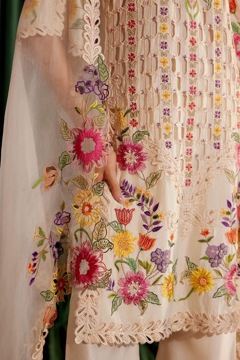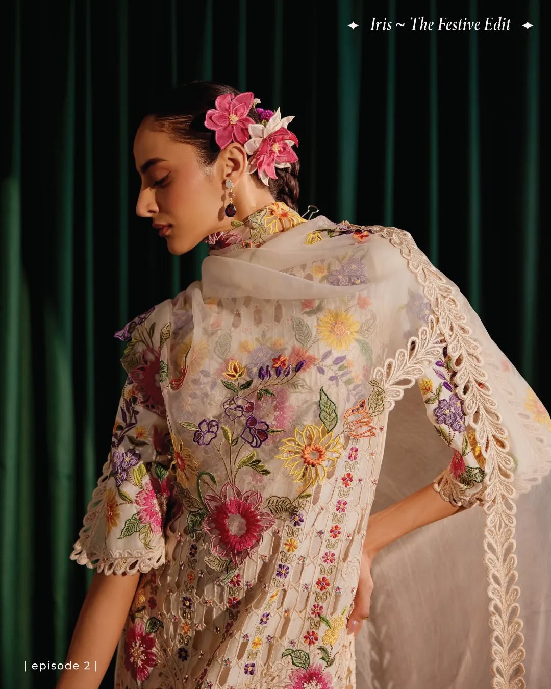 A breathtakingly elegant embroidered ensemble that exudes grace and charm. The intricate floral threadwork on a delicate ivory base creates a dreamy and ethereal look. With delicate lace accents, sheer organza dupatta, and wide-leg trousers, this outfit is a perfect blend of tradition and modern sophistication. The vibrant handcrafted floral motifs add a pop of color, making it ideal for festive occasions, weddings, or luxury soirées. 🌸💫