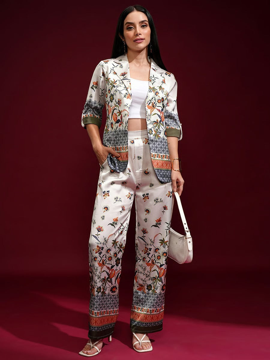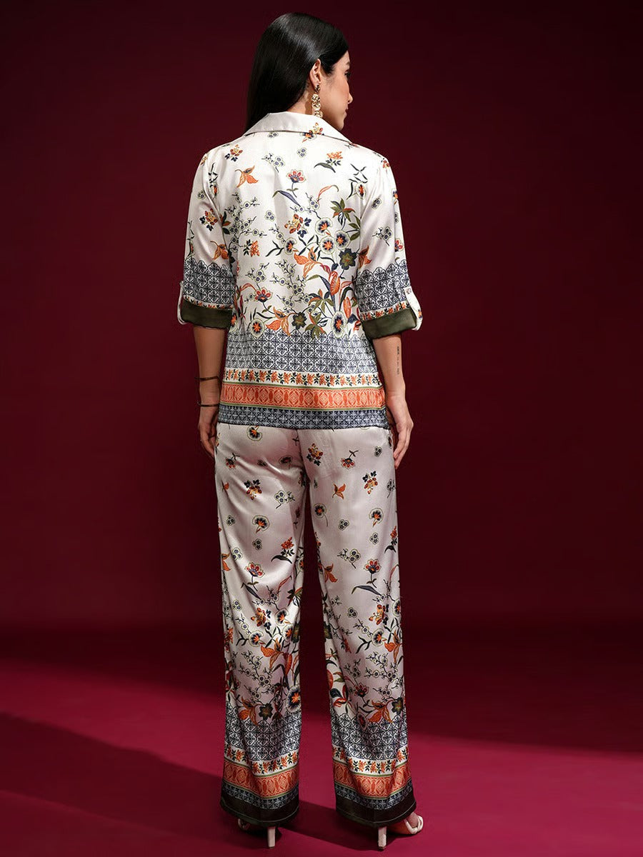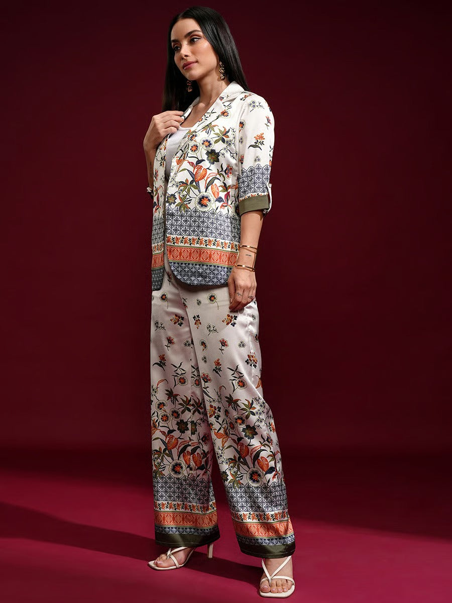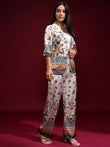 This elegant Ivory Bloom Co-Ord Set features a beautifully printed jacket-style top paired with matching wide-leg trousers. The design highlights refined floral and traditional motifs in rich, earthy tones on a soft ivory base. With its graceful silhouette and modern co-ord styling, this outfit is perfect for casual wear, brunches, and semi-formal occasions. A timeless piece that blends comfort with effortless sophistication.