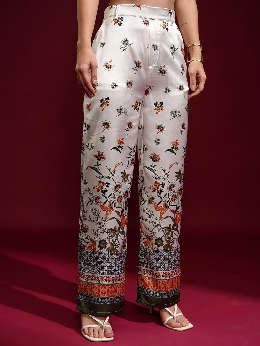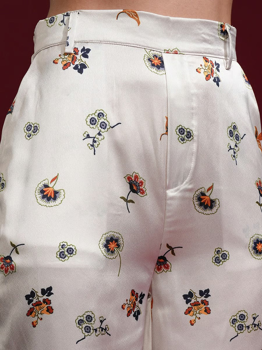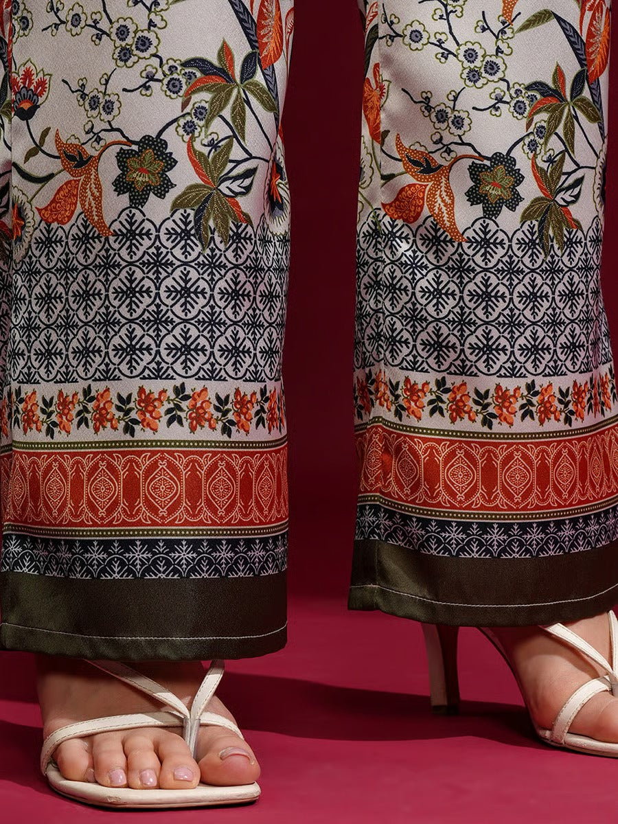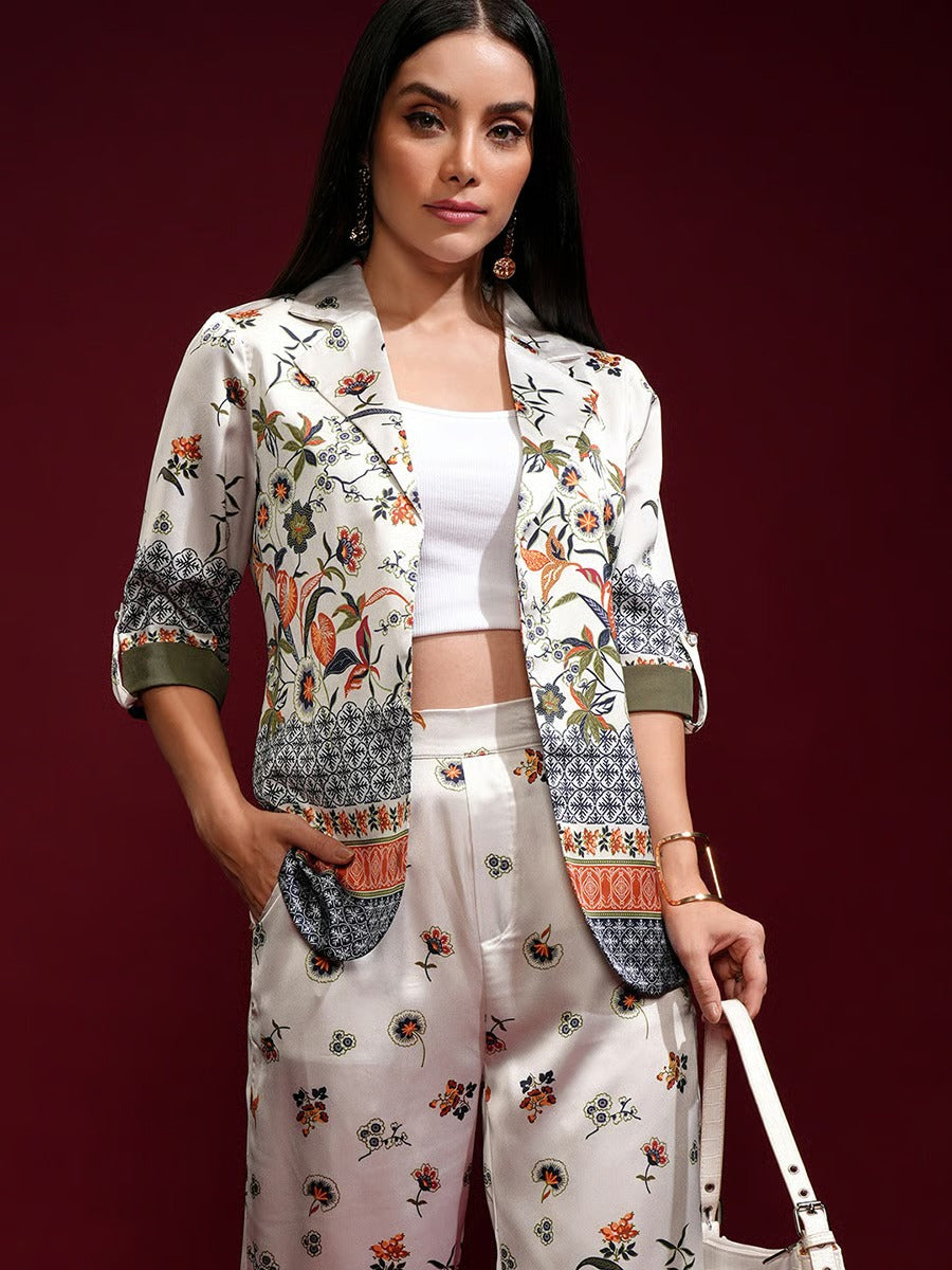 This elegant Ivory Bloom Co-Ord Set features a beautifully printed jacket-style top paired with matching wide-leg trousers. The design highlights refined floral and traditional motifs in rich, earthy tones on a soft ivory base. With its graceful silhouette and modern co-ord styling, this outfit is perfect for casual wear, brunches, and semi-formal occasions. A timeless piece that blends comfort with effortless sophistication.