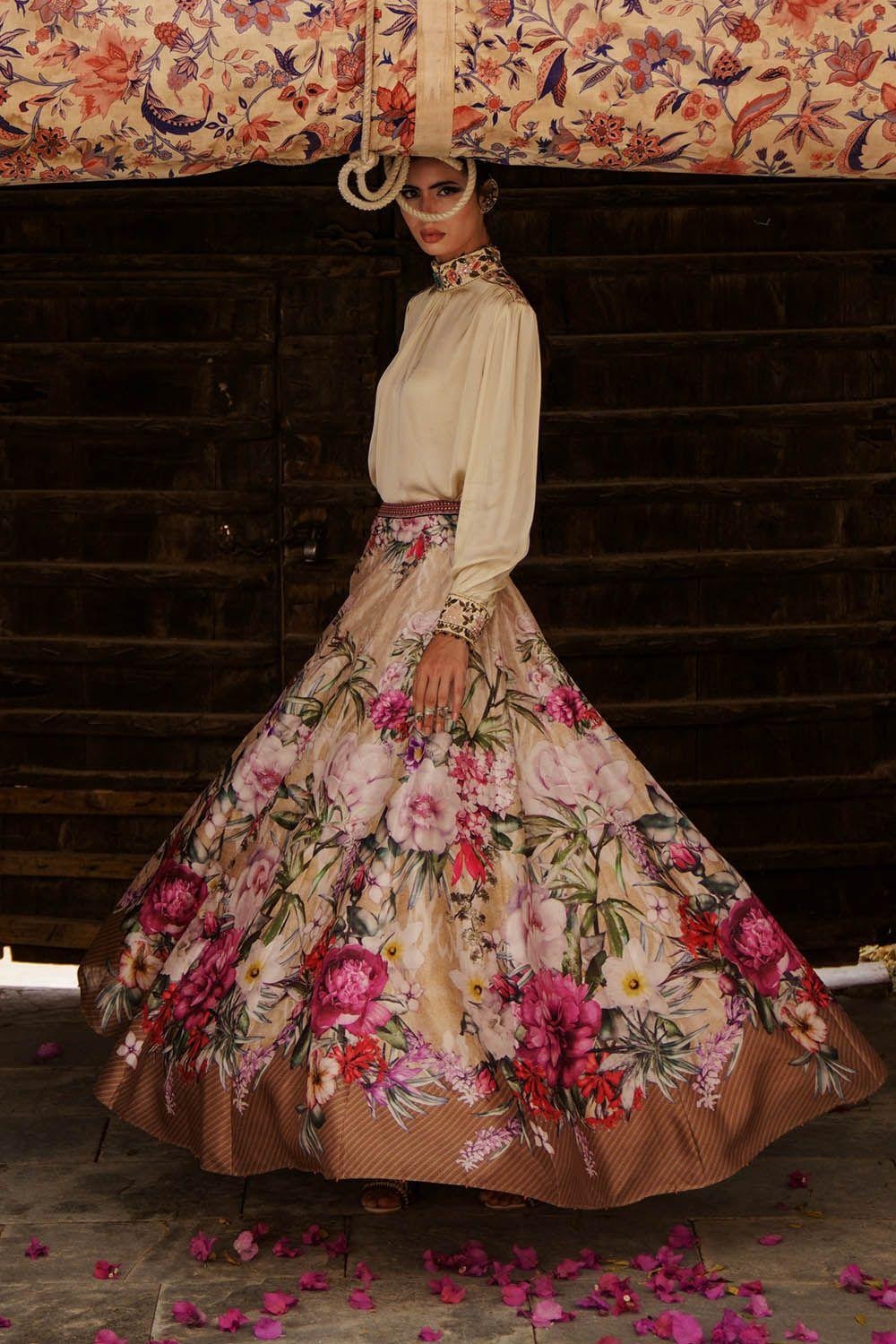 This exquisite ensemble features a cream high-neck shirt paired with a printed flared lehenga, topped off with a cropped embellished jacket. The intricate floral patterns and embellishments add a touch of elegance, making it perfect for weddings or festive occasions. The combination of traditional design elements with contemporary styling ensures a mesmerizing look.