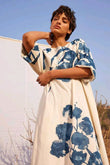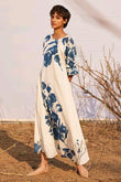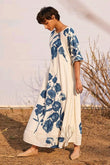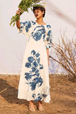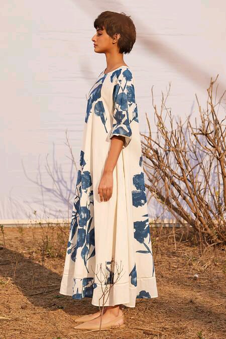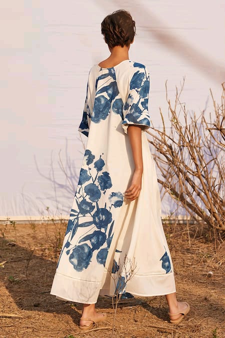 Off-white dress with blue floral print all over.