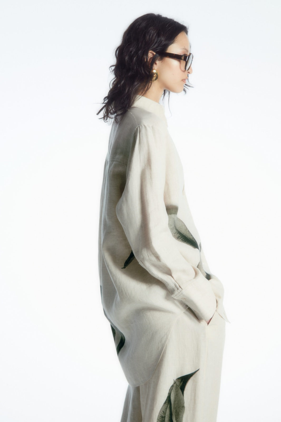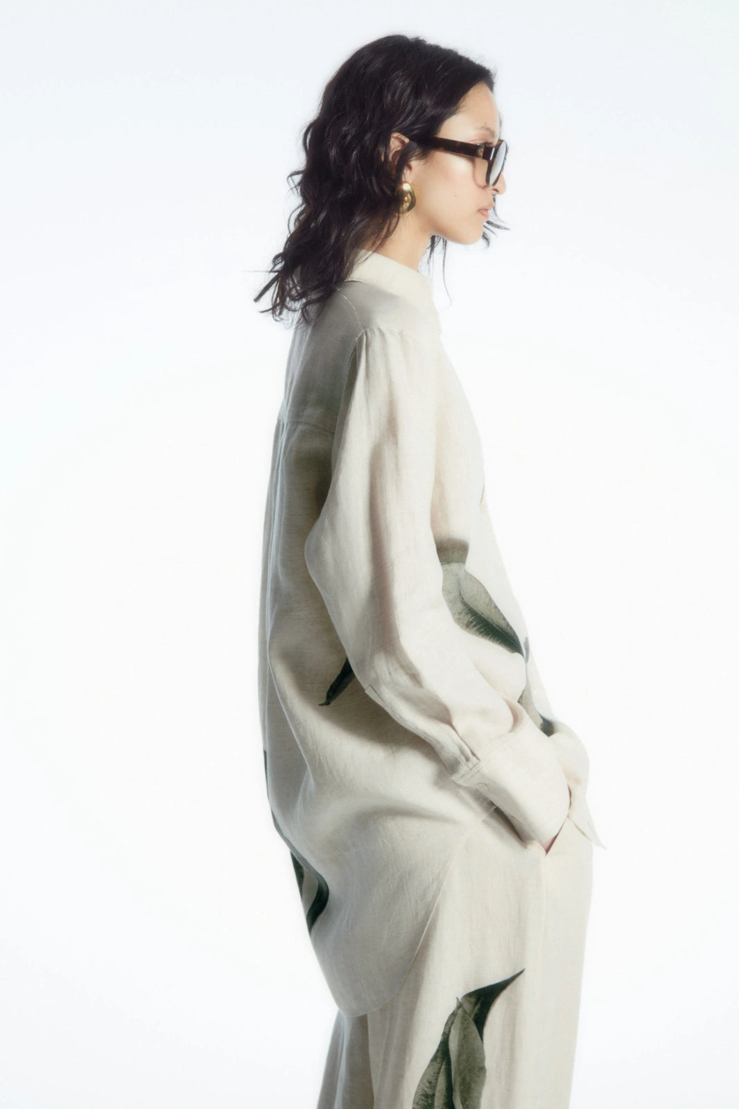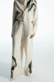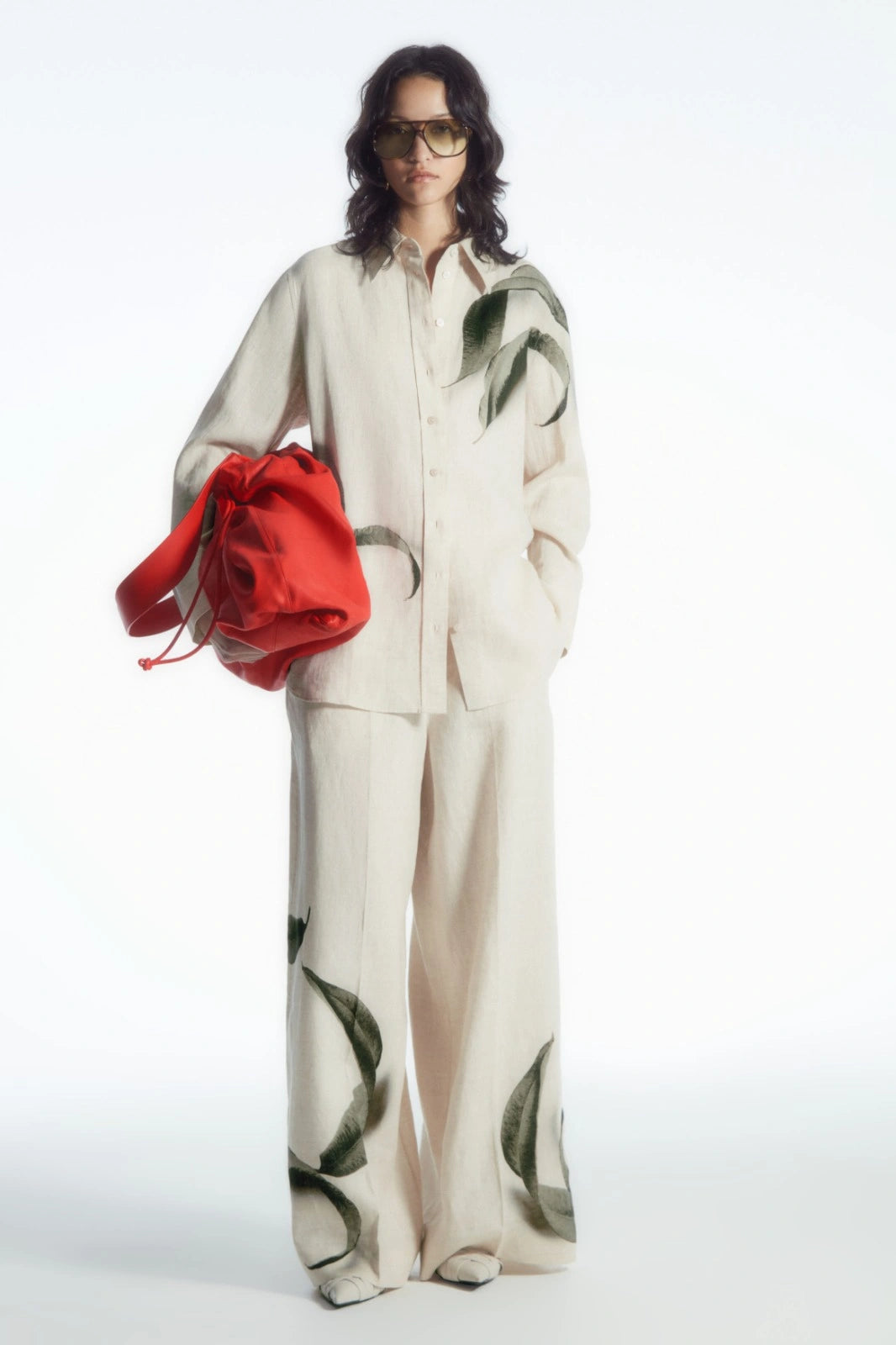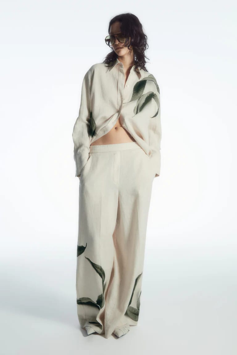 This outfit features a relaxed yet sophisticated look, perfect for an effortlessly chic style. The set includes a long-sleeved, button-up shirt with a structured collar and wide-leg trousers, both in an elegant off-white base tone. The subtle green leaf print detailing on the shirt and pants adds a refreshing touch of nature-inspired design, giving the ensemble a soft yet bold character.