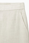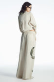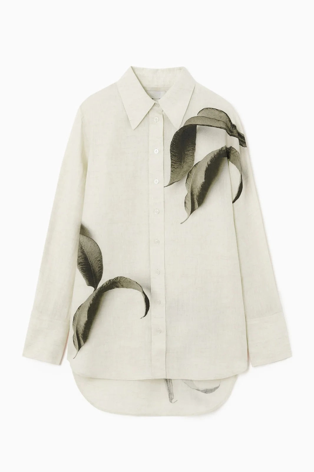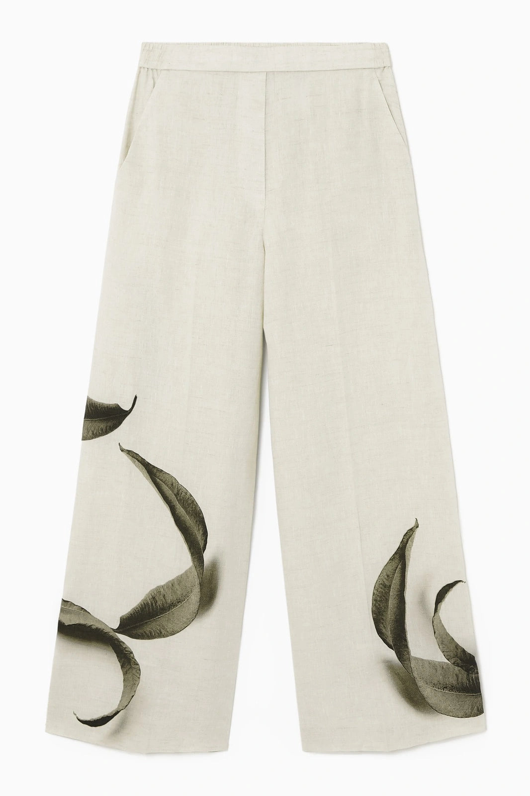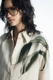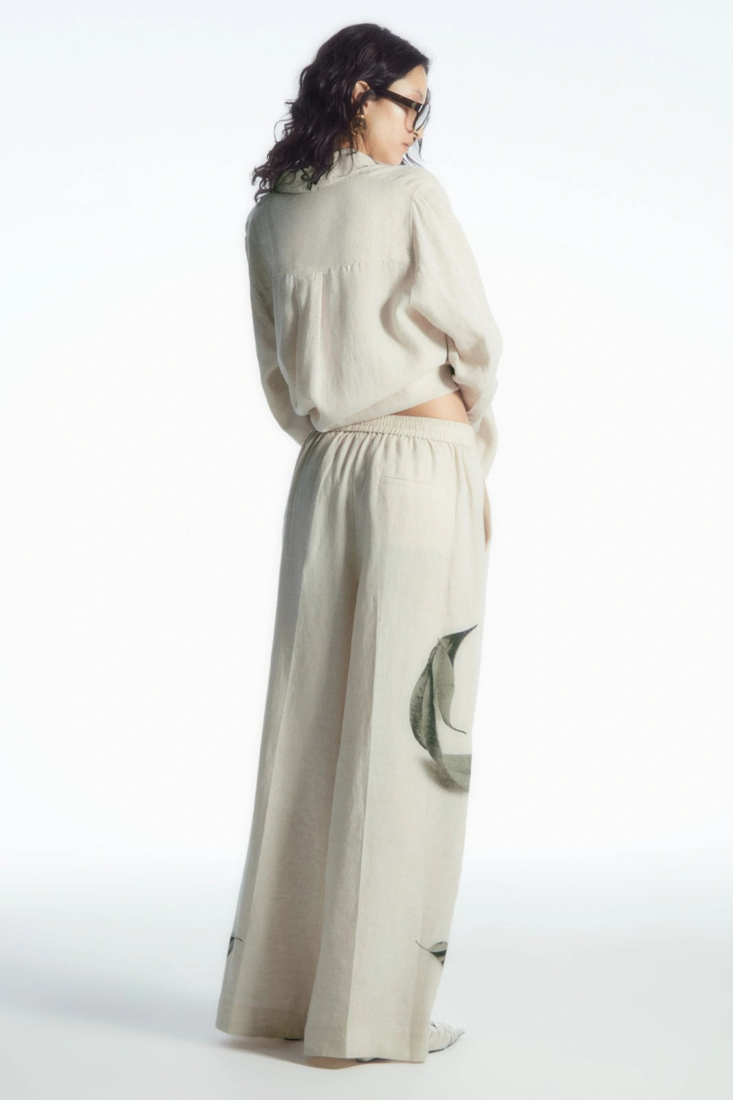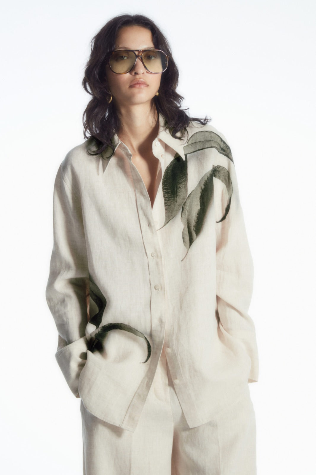 This outfit features a relaxed yet sophisticated look, perfect for an effortlessly chic style. The set includes a long-sleeved, button-up shirt with a structured collar and wide-leg trousers, both in an elegant off-white base tone. The subtle green leaf print detailing on the shirt and pants adds a refreshing touch of nature-inspired design, giving the ensemble a soft yet bold character.