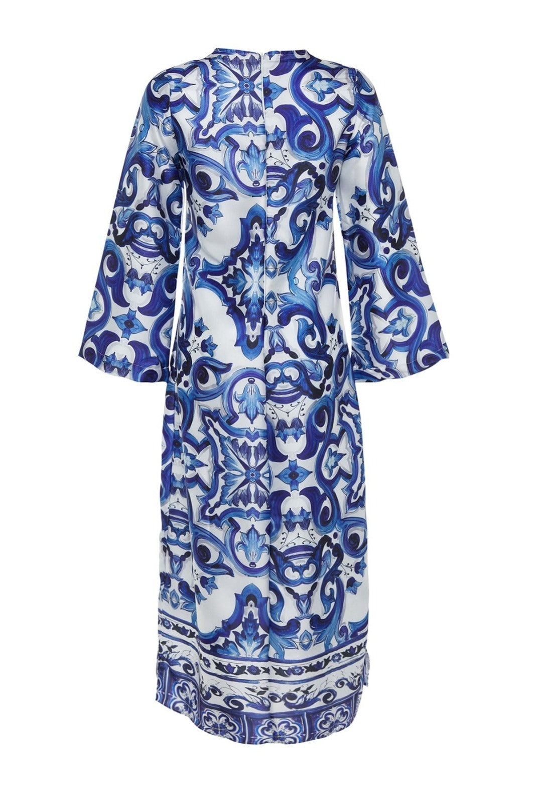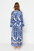 This is a luxurious satin kaftan dress featuring a striking blue and white baroque-inspired print. The loose-fit silhouette with wide sleeves offers both elegance and comfort, making it a perfect choice for evening wear, resort outings, or special occasions. The rich luxury fabric gives it a soft, glossy finish, enhancing its royal aesthetic.