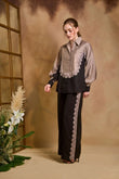 The Noir Dune Contrast Co-Ord Set is a refined expression of modern elegance. The design features a soft beige top with a relaxed silhouette and statement curved detailing across the front, creating a graceful and eye-catching focal point. The structured collar and button-down style add a polished, sophisticated touch.