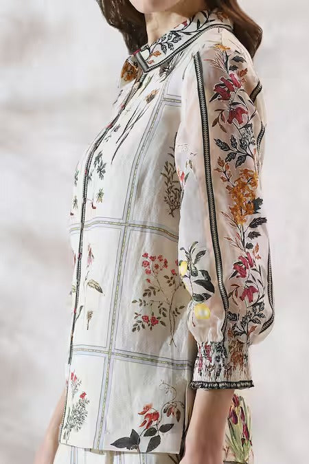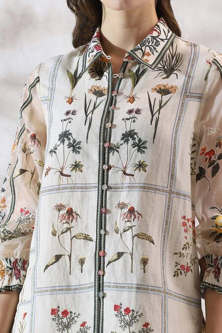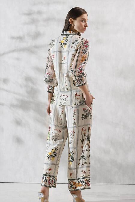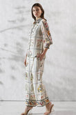 The RANNA GILL CO-ORD SET is crafted from MAD fabric, designed for a soft, comfortable, and breathable feel. Featuring an elegant ivory base with delicate floral and botanical prints, this co-ord set includes a straight-cut long shirt with subtle neckline detailing, paired with a matching wide-leg trouser. Perfect for everyday wear, daytime outings, and semi-formal occasions, this outfit offers a stylish yet relaxed look.
