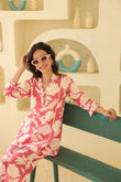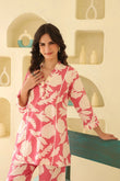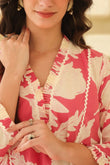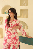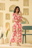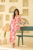 This outfit features a vibrant pink and white floral-printed co-ord set, perfect for a chic and breezy look. The ensemble consists of a V-neck, three-quarter-sleeve tunic with delicate lace details, paired with relaxed, wide-legged pants. The lightweight fabric and lively print make it ideal for casual outings, vacations, or daytime events.