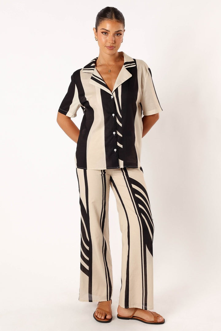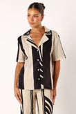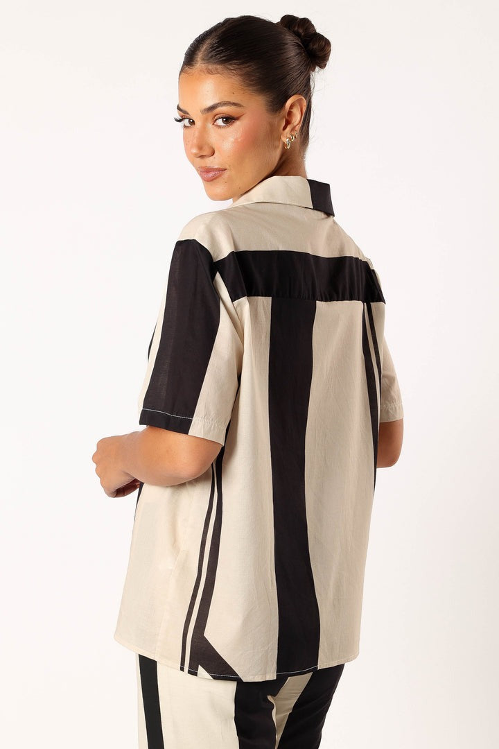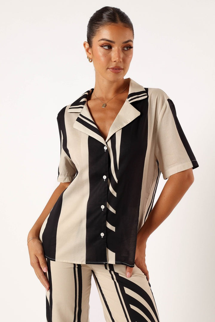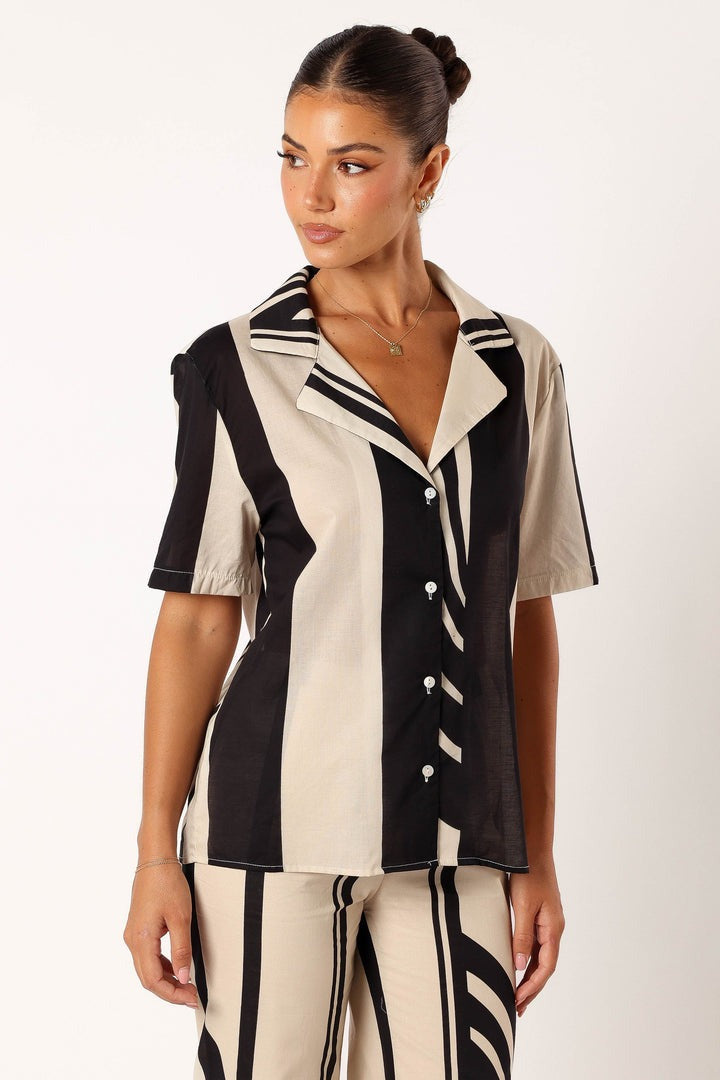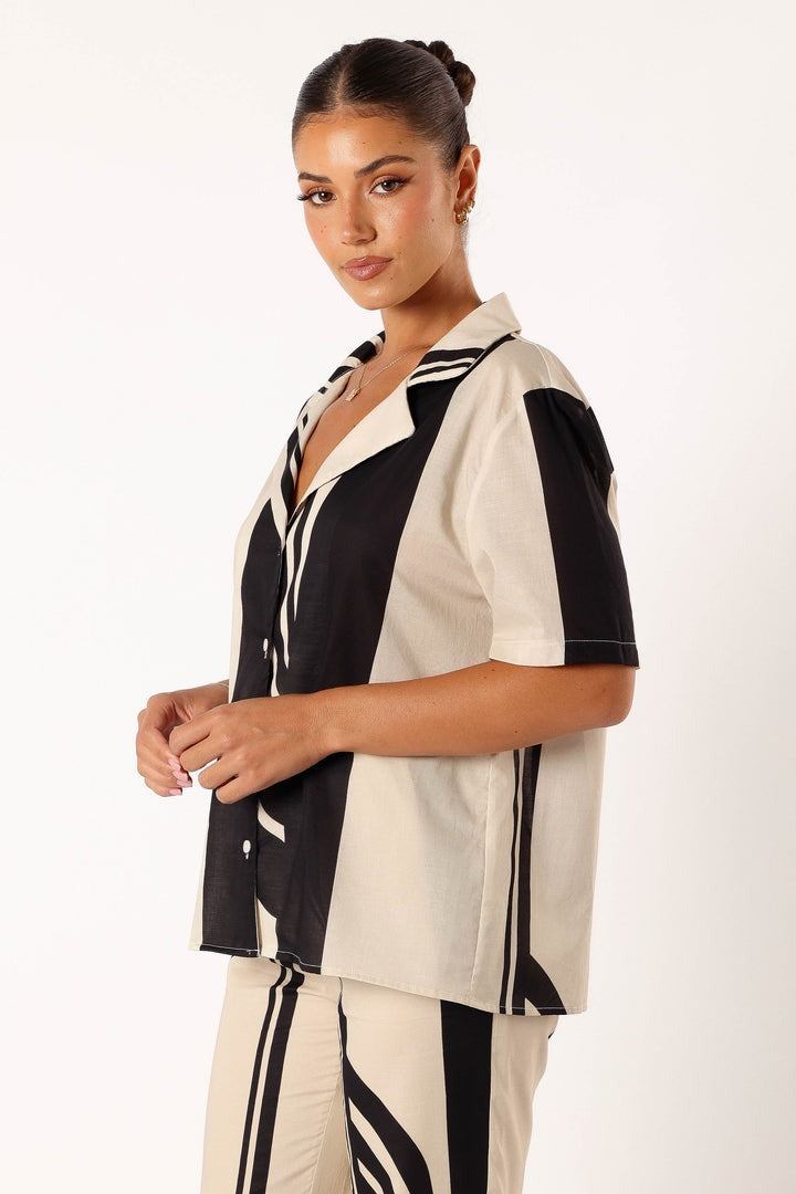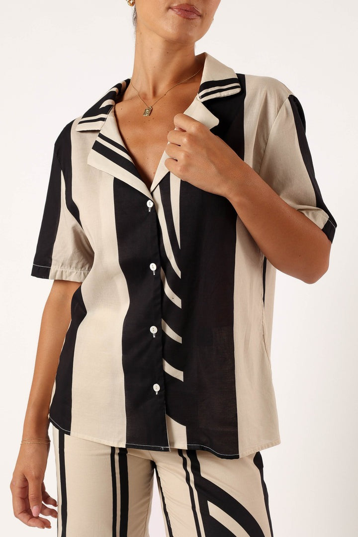 The Shirt in Black is the perfect addition to your wardrobe! This playful and trendy shirt features a v neckline collard and functional button close. Made from lightweight and breathable fabric, it's comfortable to