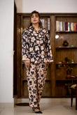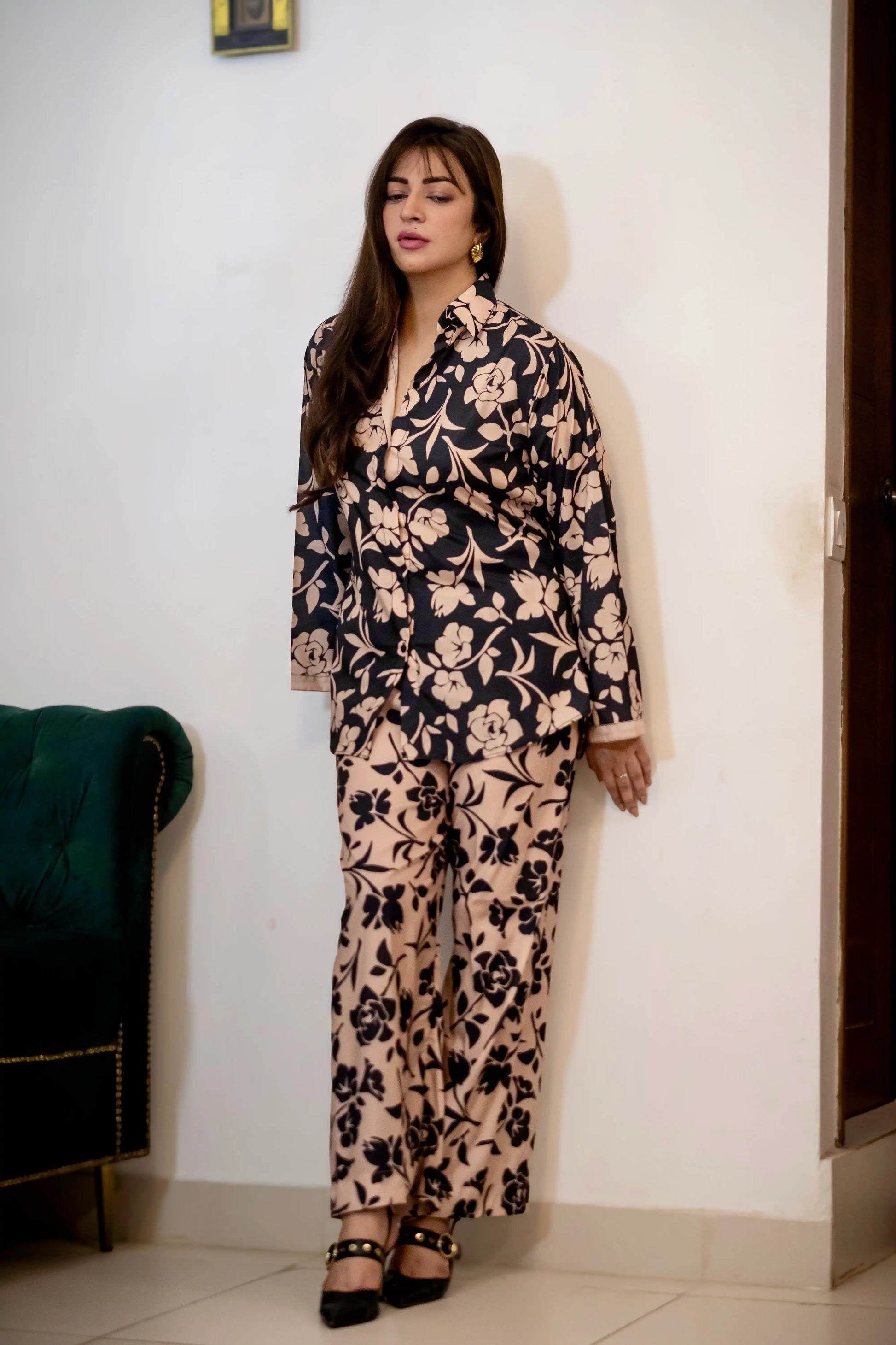 This two-piece suit features a beautiful floral print on a lightweight and breathable fabric. The shirt comes with a button-down design and long sleeves, giving it a chic and elegant appearance. The matching trousers are tailored for comfort and style, ensuring a perfect fit for any occasion.