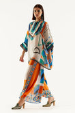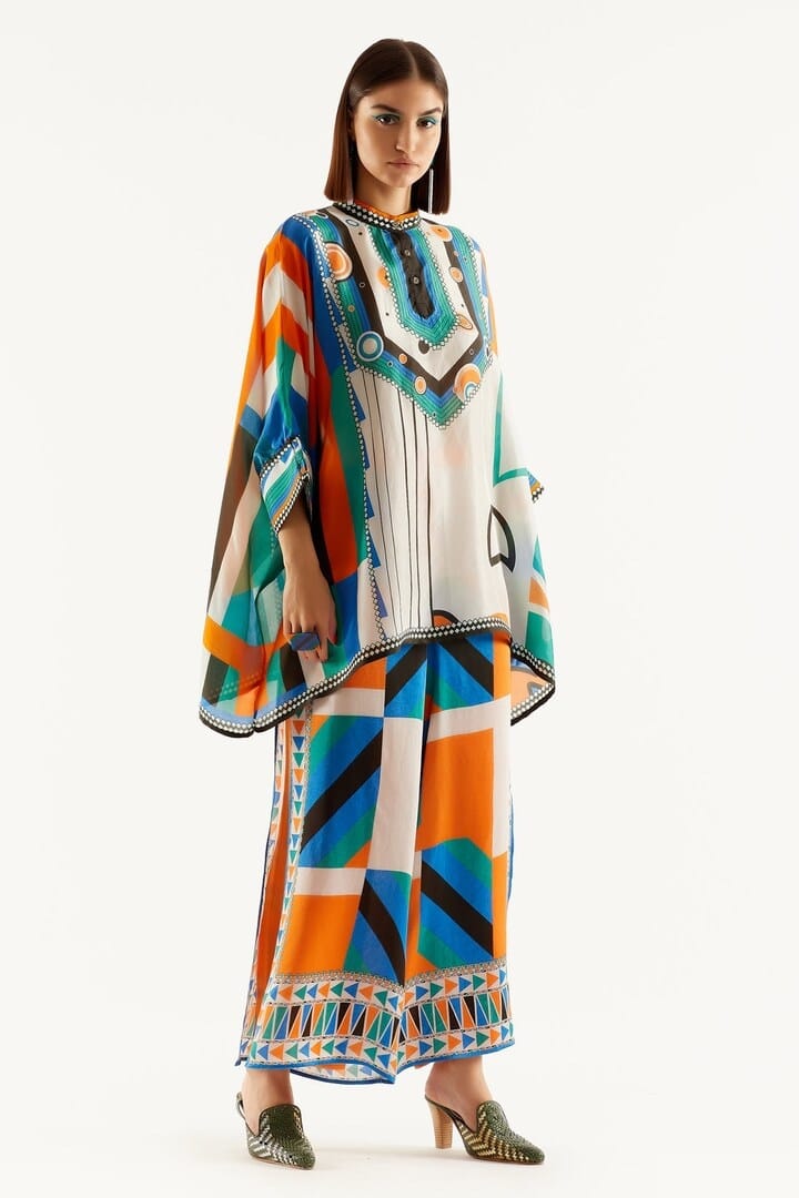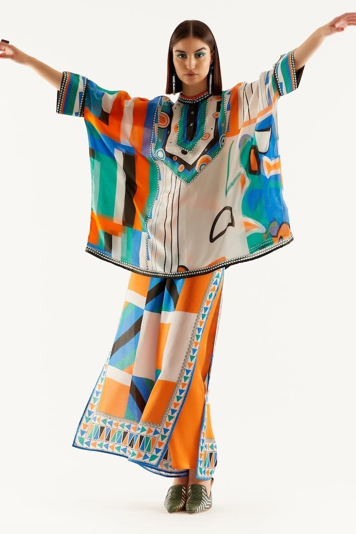 Turtle dove Mutli color geometric printed chanel tunic top.... multicolor tunic with geometric printed motifs and band collar ..rounded sleeves....the most likely focused on the two layer trouser created with two piece inside is solid and the upper is printed with sided open to looks more stunning