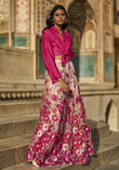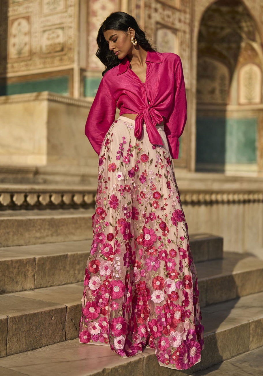 This breathtaking outfit radiates grace and charm. The magenta blouse, with its statement tie-up front, brings a bold and contemporary edge. Complementing it perfectly is a stunning blush pink skirt, intricately with vibrant floral patterns that cascade beautifully to create a dreamy, ethereal look. This ensemble is a celebration of modern elegance fused with timeless artistry—ideal for weddings, festive gatherings, or making a statement at any special event.