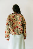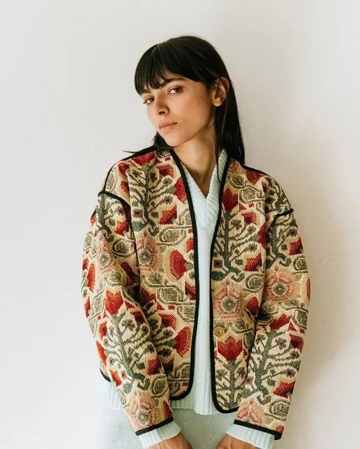 This fLOWER Varsity Jacket is constructed from multiple vintage textiles found in Pasadena, CA. Textiles are all muted in tone and have woven depictions of various florals throughout.