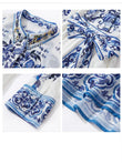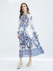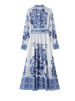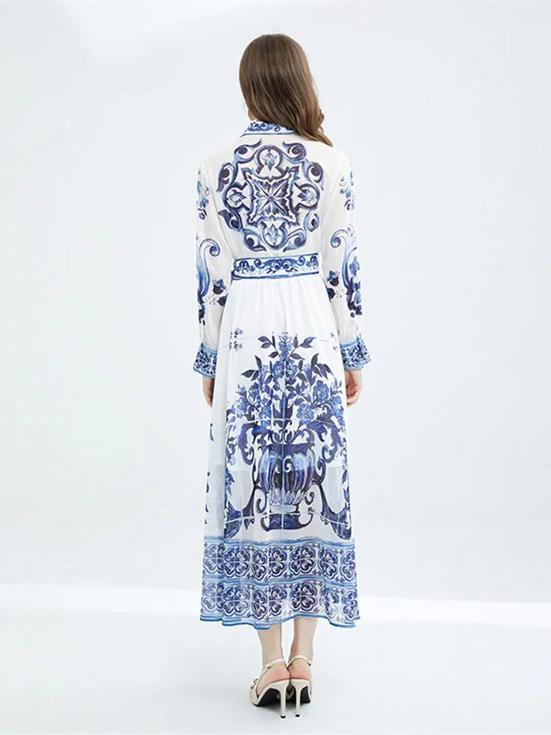 This is a long-sleeve printed maxi dress featuring an elegant white and blue porcelain-inspired design. It has a button-down front, a classic shirt collar, and a waist belt for a flattering silhouette. The intricate blue