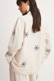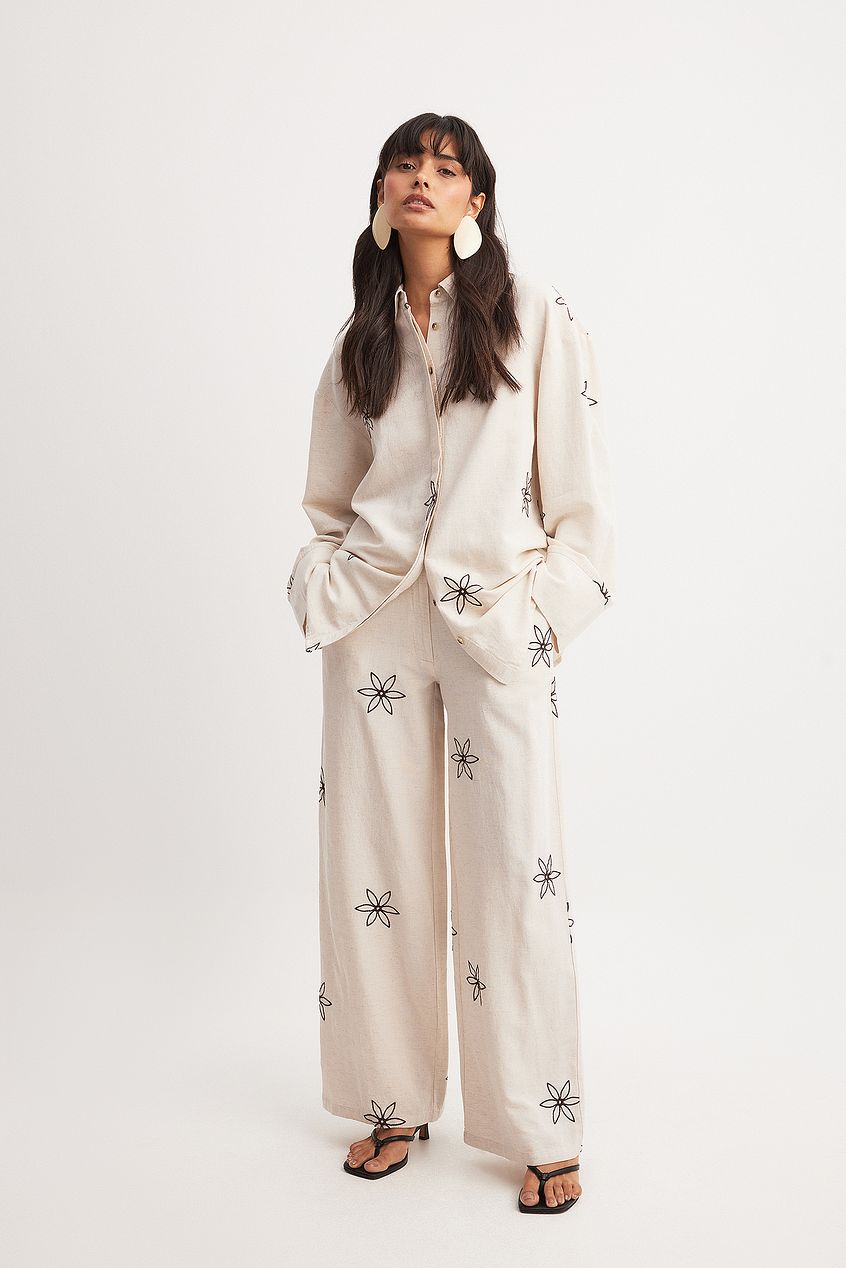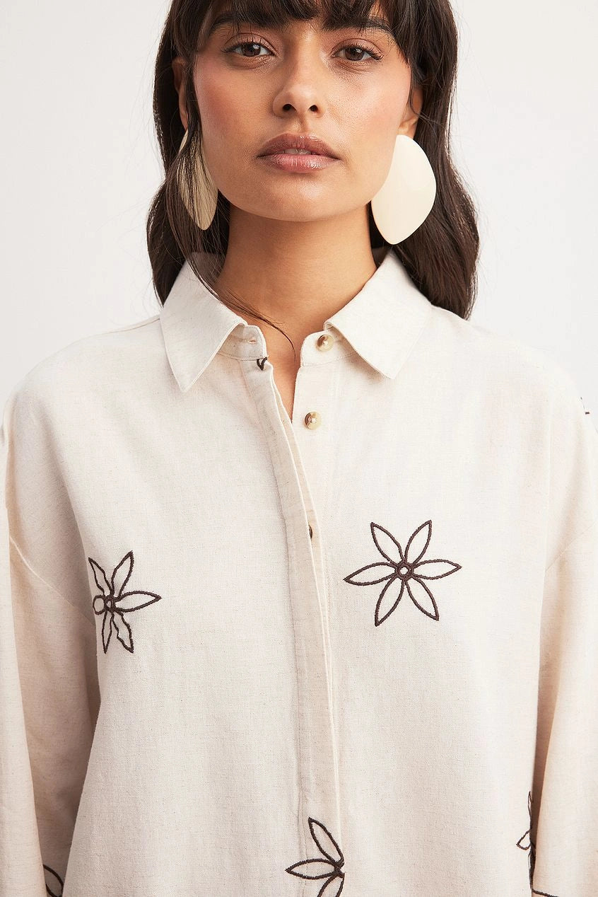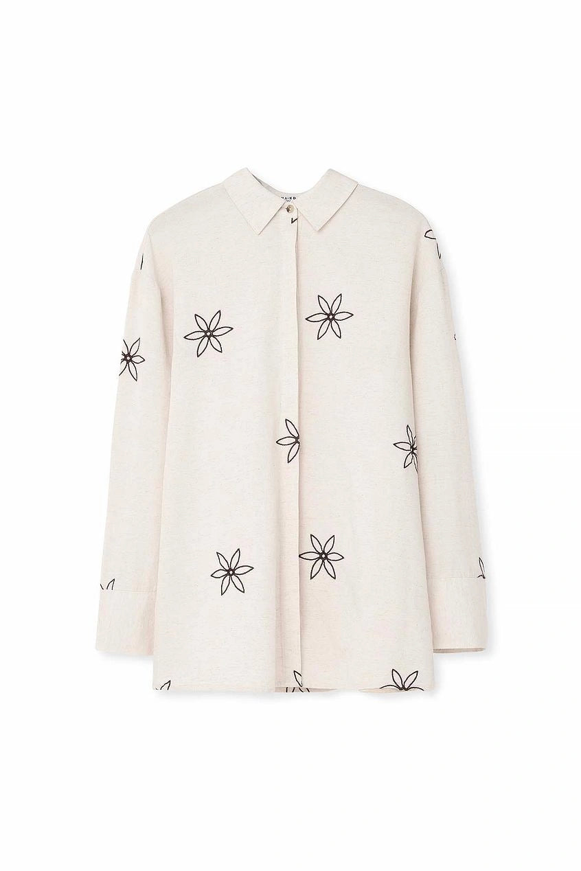 This shirt is oversized and features a flower print and wide sleeves. It has concealed button closures. This shirt comes in beige.