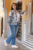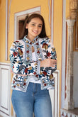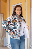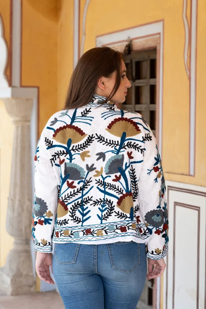 Unveil a world of elegance with our "Royal suzani." This exquisite jacket features an white base adorned with a stunning array of red, peach, and light yellow flowers with vibrant green petals, creating a captivating and graceful design....