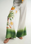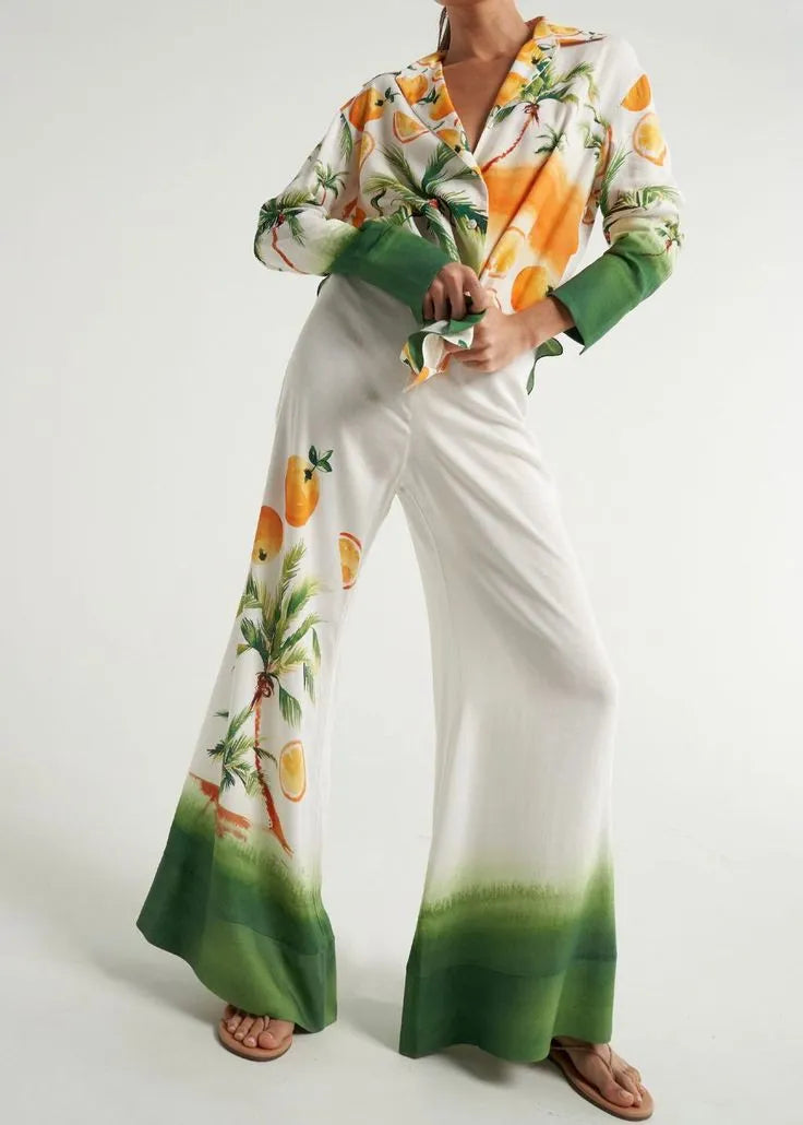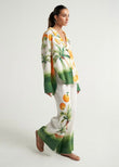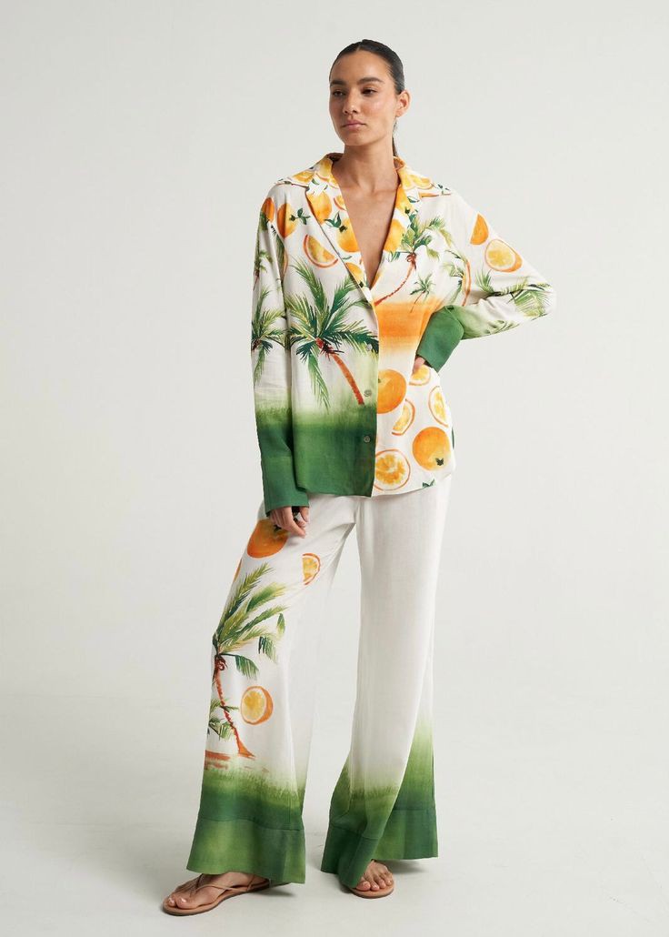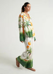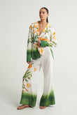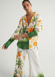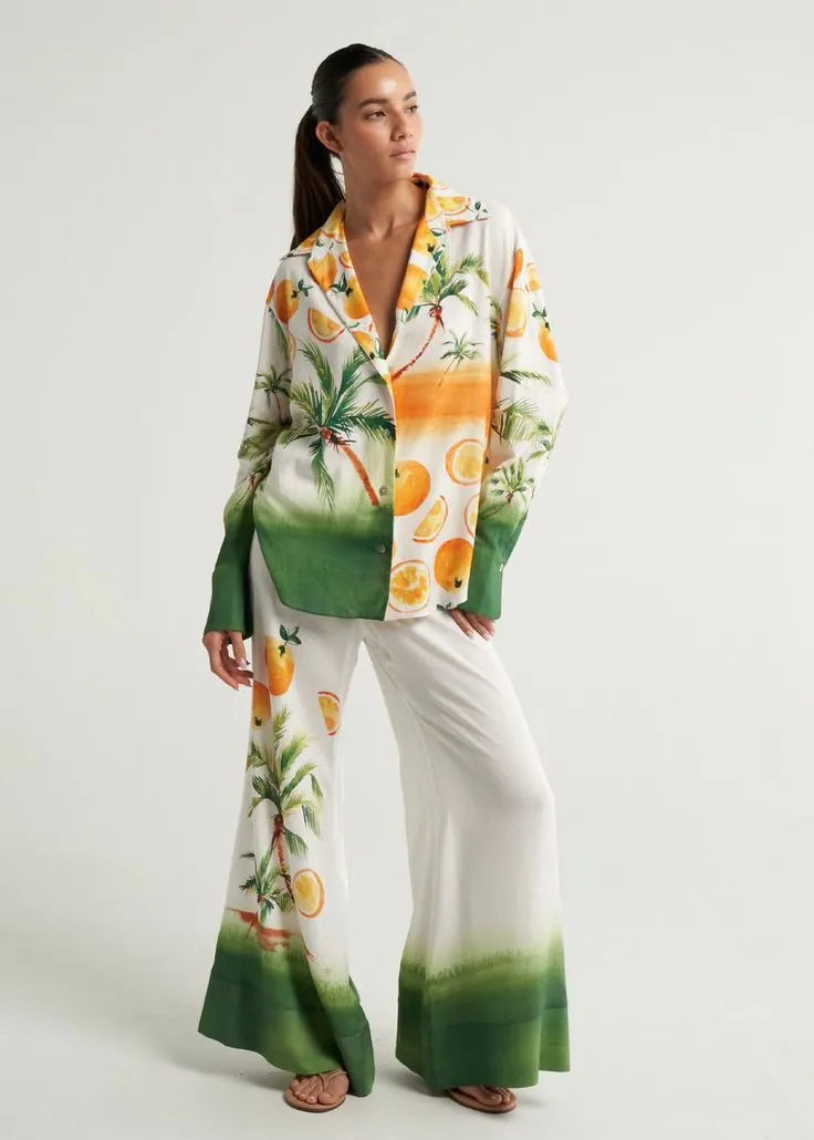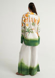 Long sleeve button down shirt with high low hem. It features long cuffs and shell buttons at center front. Hand-drawn "Miami" print by MFY GOLD, placed strategically on the body, neck and sleeves. Handcrafted in luxurious fabric.