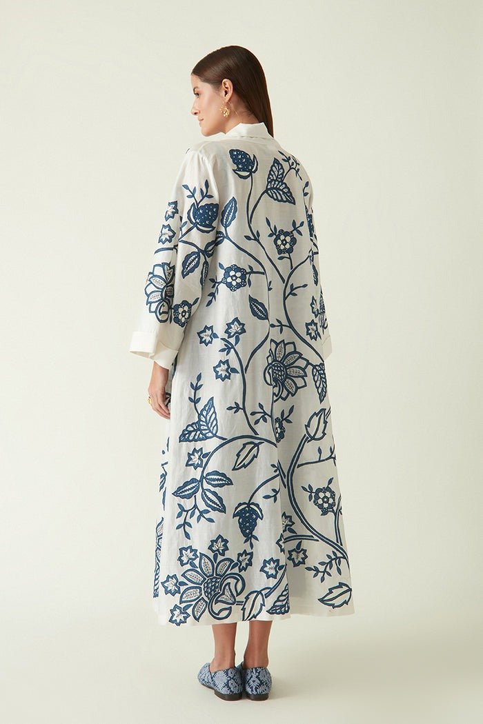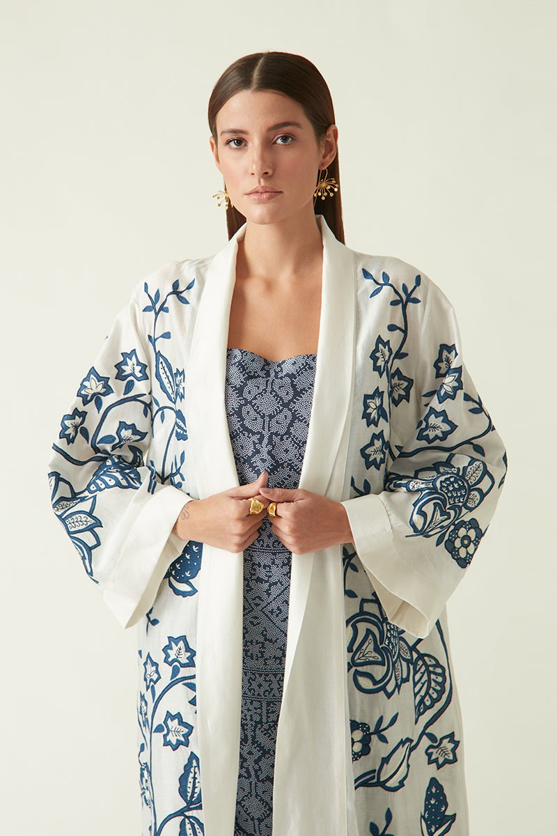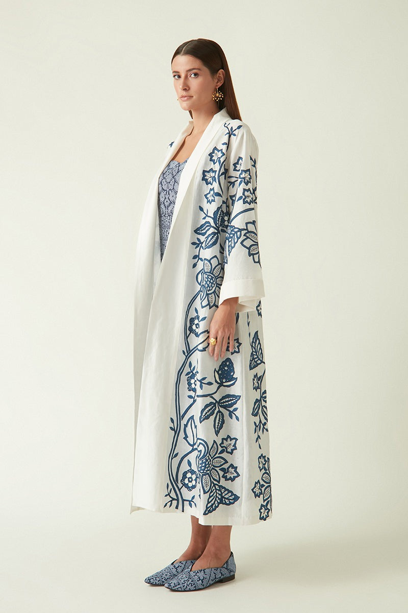 Wokam Embroidered Overlay in cotton silk with all over applique embroidery and hand stitch detailing. Team it up with our Singkep printed slip dress to complete teh look. A wardrobe classic and a piece that can be worn often in its many avatars and cherished. Dry Clean only. Warm iron if needed. Do not bleach. Do not Tumble dry.All our products are artisanal, small-batch and hand-made.
