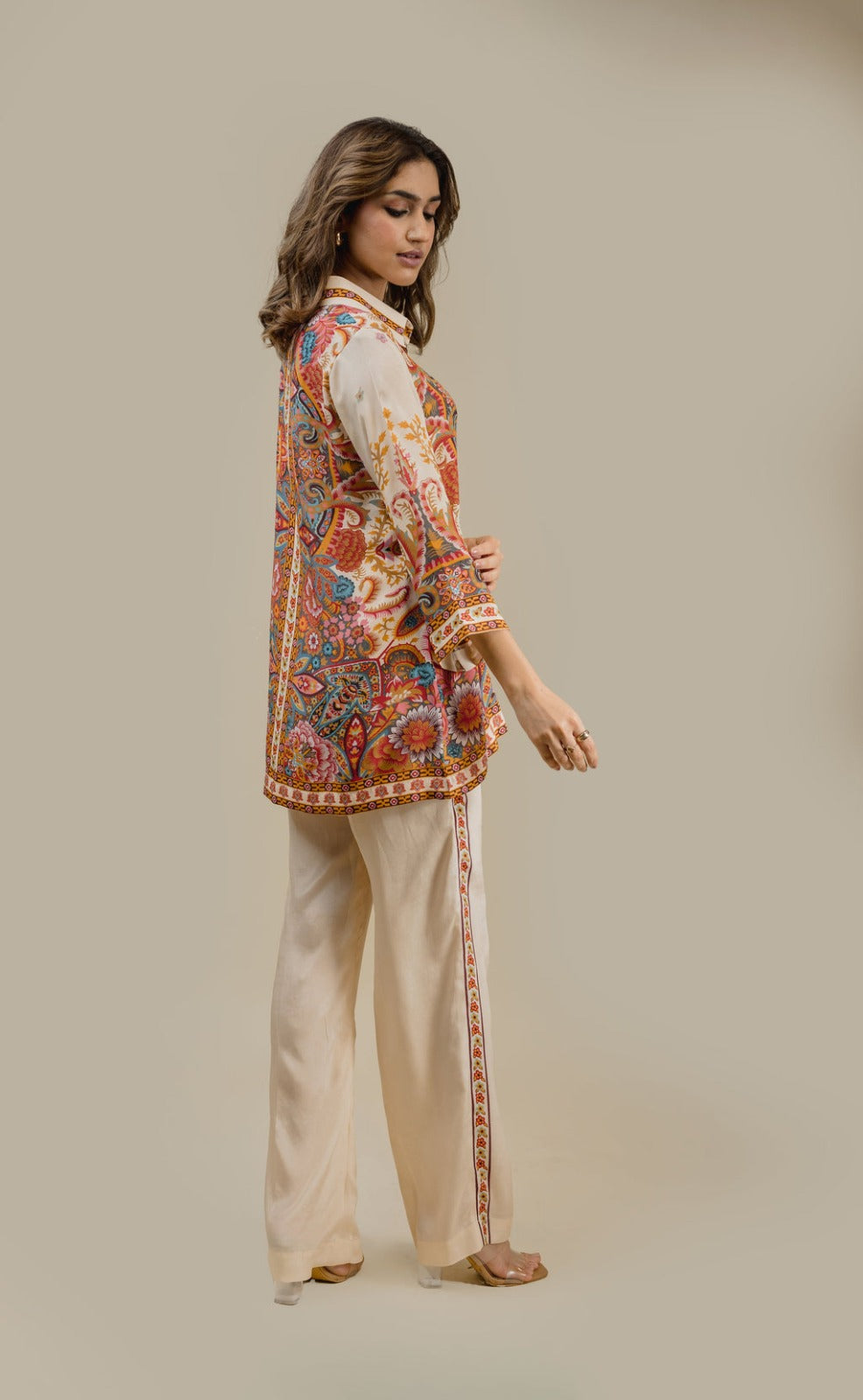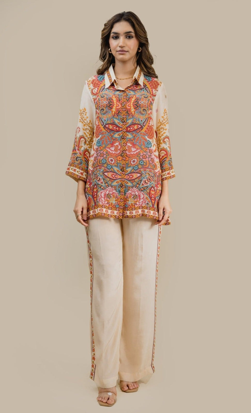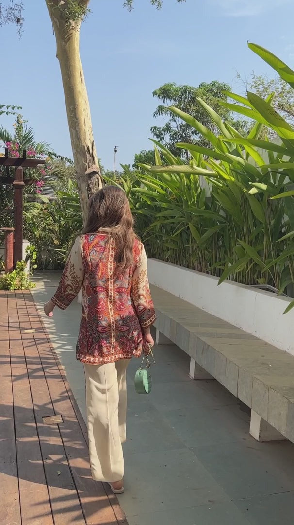 This elegant two-piece outfit features a beautifully printed paisley shirt with rich, vibrant tones and a classic button-down front. The shirt is paired with straight-cut ivory trousers, enhanced with a subtle printed side border that perfectly complements the shirt design. Crafted from premium-quality fabric, this ensemble offers comfort, sophistication, and effortless style—ideal for casual chic wear, office looks, or semi-formal gatherings.