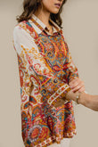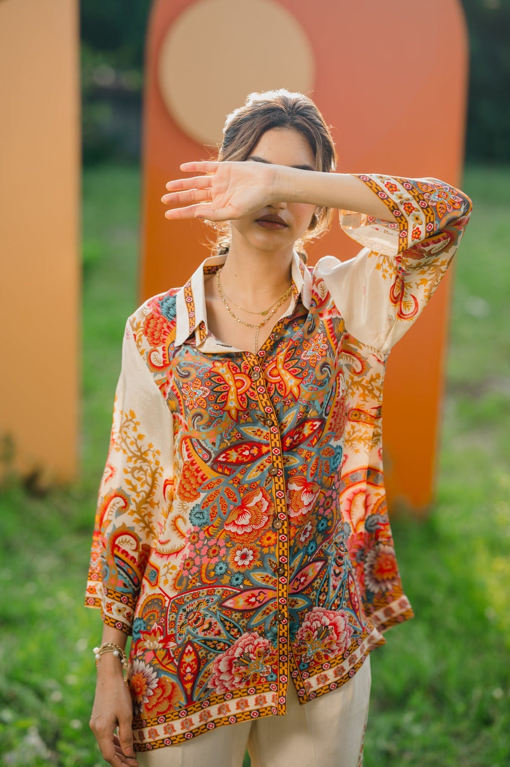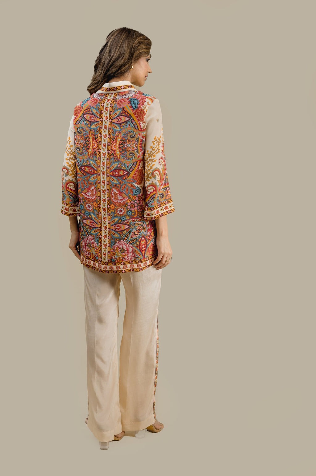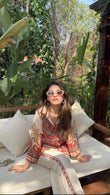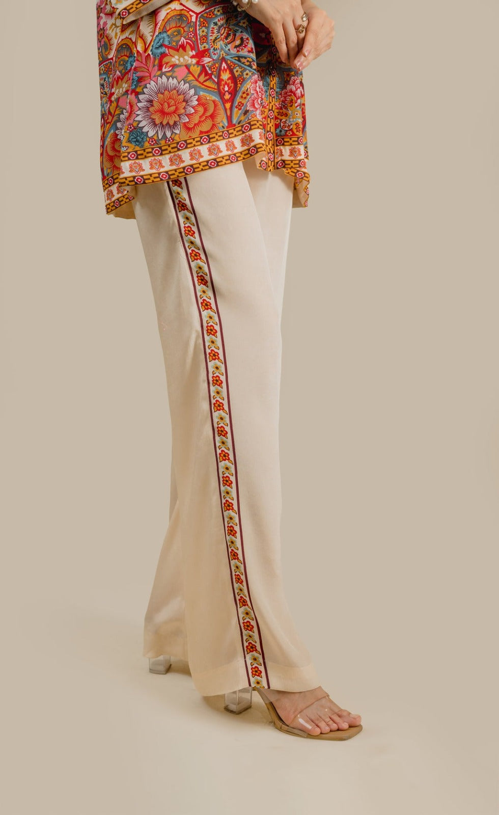This elegant two-piece outfit features a beautifully printed paisley shirt with rich, vibrant tones and a classic button-down front. The shirt is paired with straight-cut ivory trousers, enhanced with a subtle printed side border that perfectly complements the shirt design. Crafted from premium-quality fabric, this ensemble offers comfort, sophistication, and effortless style—ideal for casual chic wear, office looks, or semi-formal gatherings.